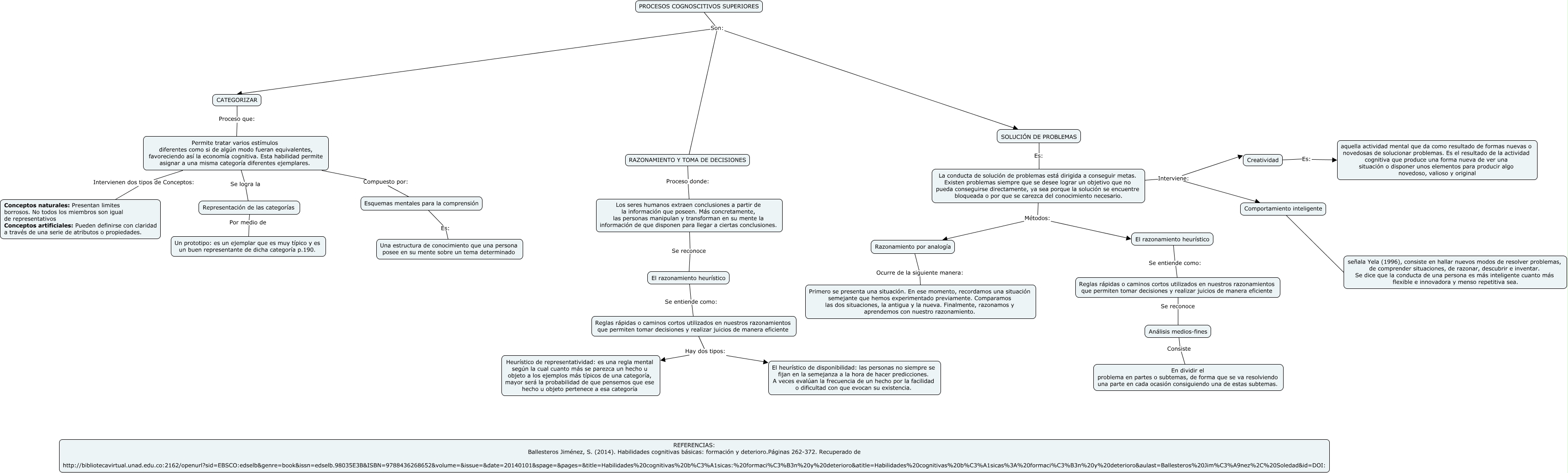 Este Cmap, tiene información relacionada con: PROCESOS COGNOSITIVOS SUPERIORES, Comportamiento inteligente ???? señala Yela (1996), consiste en hallar nuevos modos de resolver problemas, de comprender situaciones, de razonar, descubrir e inventar. Se dice que la conducta de una persona es más inteligente cuanto más flexible e innovadora y menso repetitiva sea., Análisis medios-fines Consiste En dividir el problema en partes o subtemas, de forma que se va resolviendo una parte en cada ocasión consiguiendo una de estas subtemas., Permite tratar varios estímulos diferentes como si de algún modo fueran equivalentes, favoreciendo así la economía cognitiva. Esta habilidad permite asignar a una misma categoría diferentes ejemplares. Compuesto por: Esquemas mentales para la comprensión, La conducta de solución de problemas está dirigida a conseguir metas. Existen problemas siempre que se desee lograr un objetivo que no pueda conseguirse directamente, ya sea porque la solución se encuentre bloqueada o por que se carezca del conocimiento necesario. Métodos: Razonamiento por analogía, Permite tratar varios estímulos diferentes como si de algún modo fueran equivalentes, favoreciendo así la economía cognitiva. Esta habilidad permite asignar a una misma categoría diferentes ejemplares. Se logra la Representación de las categorías, Representación de las categorías Por medio de Un prototipo: es un ejemplar que es muy típico y es un buen representante de dicha categoría p.190., PROCESOS COGNOSCITIVOS SUPERIORES Son: RAZONAMIENTO Y TOMA DE DECISIONES, Los seres humanos extraen conclusiones a partir de la información que poseen. Más concretamente, las personas manipulan y transforman en su mente la información de que disponen para llegar a ciertas conclusiones. Se reconoce El razonamiento heurístico, Reglas rápidas o caminos cortos utilizados en nuestros razonamientos que permiten tomar decisiones y realizar juicios de manera eficiente Hay dos tipos: El heurístico de disponibilidad: las personas no siempre se fijan en la semejanza a la hora de hacer predicciones. A veces evalúan la frecuencia de un hecho por la facilidad o dificultad con que evocan su existencia., PROCESOS COGNOSCITIVOS SUPERIORES Son: CATEGORIZAR, CATEGORIZAR Proceso que: Permite tratar varios estímulos diferentes como si de algún modo fueran equivalentes, favoreciendo así la economía cognitiva. Esta habilidad permite asignar a una misma categoría diferentes ejemplares., La conducta de solución de problemas está dirigida a conseguir metas. Existen problemas siempre que se desee lograr un objetivo que no pueda conseguirse directamente, ya sea porque la solución se encuentre bloqueada o por que se carezca del conocimiento necesario. Interviene: Creatividad, Permite tratar varios estímulos diferentes como si de algún modo fueran equivalentes, favoreciendo así la economía cognitiva. Esta habilidad permite asignar a una misma categoría diferentes ejemplares. Intervienen dos tipos de Conceptos: Conceptos naturales: Presentan limites borrosos. No todos los miembros son igual de representativos Conceptos artificiales: Pueden definirse con claridad a través de una serie de atributos o propiedades., Reglas rápidas o caminos cortos utilizados en nuestros razonamientos que permiten tomar decisiones y realizar juicios de manera eficiente Se reconoce Análisis medios-fines, Creatividad Es: aquella actividad mental que da como resultado de formas nuevas o novedosas de solucionar problemas. Es el resultado de la actividad cognitiva que produce una forma nueva de ver una situación o disponer unos elementos para producir algo novedoso, valioso y original, PROCESOS COGNOSCITIVOS SUPERIORES Son: SOLUCIÓN DE PROBLEMAS, El razonamiento heurístico Se entiende como: Reglas rápidas o caminos cortos utilizados en nuestros razonamientos que permiten tomar decisiones y realizar juicios de manera eficiente, Esquemas mentales para la comprensión Es: Una estructura de conocimiento que una persona posee en su mente sobre un tema determinado, La conducta de solución de problemas está dirigida a conseguir metas. Existen problemas siempre que se desee lograr un objetivo que no pueda conseguirse directamente, ya sea porque la solución se encuentre bloqueada o por que se carezca del conocimiento necesario. Métodos: El razonamiento heurístico, RAZONAMIENTO Y TOMA DE DECISIONES Proceso donde: Los seres humanos extraen conclusiones a partir de la información que poseen. Más concretamente, las personas manipulan y transforman en su mente la información de que disponen para llegar a ciertas conclusiones.