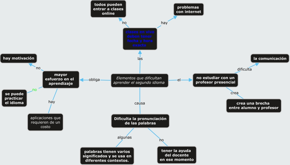 Este Cmap, tiene información relacionada con: justificación, mayor esfuerzo en el aprendizaje no hay motivación, Elementos que dificultan aprender el segundo idioma el no estudiar con un profesor presencial, no estudiar con un profesor presencial dificulta la comunicación, Elementos que dificultan aprender el segundo idioma obliga mayor esfuerzo en el aprendizaje, Elementos que dificultan aprender el segundo idioma las clases en vivo deben tener fecha y hora exacta, clases en vivo deben tener fecha y hora exacta hay problemas con internet, Dificulta la pronunciación de las palabras no tener la ayuda del docente en ese momento, Elementos que dificultan aprender el segundo idioma causa Dificulta la pronunciación de las palabras, mayor esfuerzo en el aprendizaje no se puede practicar el idioma, no estudiar con un profesor presencial crea crea una brecha entre alumno y profesor, Dificulta la pronunciación de las palabras algunas palabras tienen varios significados y se usa en diferentes contextos., mayor esfuerzo en el aprendizaje hay aplicaciones que requieren de un costo, clases en vivo deben tener fecha y hora exacta no todos pueden entrar a clases online