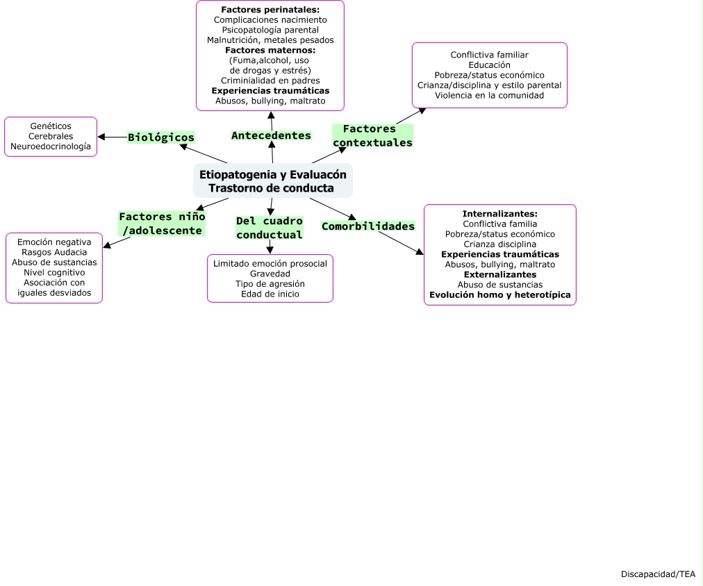 Este Cmap, tiene información relacionada con: violencia, Etiopatogenia y Evaluacón Trastorno de conducta Comorbilidades Internalizantes: Conflictiva familia Pobreza/status económico Crianza disciplina Experiencias traumáticas Abusos, bullying, maltrato Externalizantes Abuso de sustancias Evolución homo y heterotípica, Etiopatogenia y Evaluacón Trastorno de conducta Factores contextuales Conflictiva familiar Educación Pobreza/status económico Crianza/disciplina y estilo parental Violencia en la comunidad, Etiopatogenia y Evaluacón Trastorno de conducta Factores niño /adolescente Emoción negativa Rasgos Audacia Abuso de sustancias Nivel cognitivo Asociación con iguales desviados, Etiopatogenia y Evaluacón Trastorno de conducta Del cuadro conductual Limitado emoción prosocial Gravedad Tipo de agresión Edad de inicio, Etiopatogenia y Evaluacón Trastorno de conducta Antecedentes Factores perinatales: Complicaciones nacimiento Psicopatología parental Malnutrición, metales pesados Factores maternos: (Fuma,alcohol, uso de drogas y estrés) Criminialidad en padres Experiencias traumáticas Abusos, bullying, maltrato, Etiopatogenia y Evaluacón Trastorno de conducta Biológicos Genéticos Cerebrales Neuroedocrinología