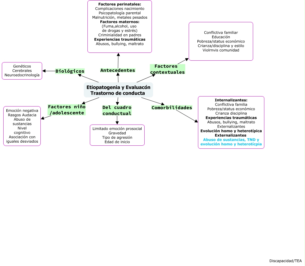 Este Cmap, tiene información relacionada con: violencia02, Etiopatogenia y Evaluacón Trastorno de conducta Factores niño /adolescente Emoción negativa Rasgos Audacia Abuso de sustancias Nivel cognitivo Asociación con iguales desviados, Etiopatogenia y Evaluacón Trastorno de conducta Factores contextuales Conflictiva familiar Educación Pobreza/status económico Crianza/disciplina y estilo Violrnvis comunidad, Etiopatogenia y Evaluacón Trastorno de conducta Biológicos Genéticos Cerebrales Neuroedocrinología, Etiopatogenia y Evaluacón Trastorno de conducta Comorbilidades Internalizantes: Conflictiva familia Pobreza/status económico Crianza disciplina Experiencias traumáticas Abusos, bullying, maltrato Externalizantes Evolución homo y heterotípica Externalizantes Abuso de sustancias, TND y evolución homo y heterotícpia, Etiopatogenia y Evaluacón Trastorno de conducta Del cuadro conductual Limitado emoción prosocial Gravedad Tipo de agresión Edad de inicio, Etiopatogenia y Evaluacón Trastorno de conducta Antecedentes Factores perinatales: Complicaciones nacimiento Psicopatología parental Malnutrición, metales pesados Factores maternos: (Fuma,alcohol, uso de drogas y estrés) Criminialidad en padres Experiencias traumáticas Abusos, bullying, maltrato