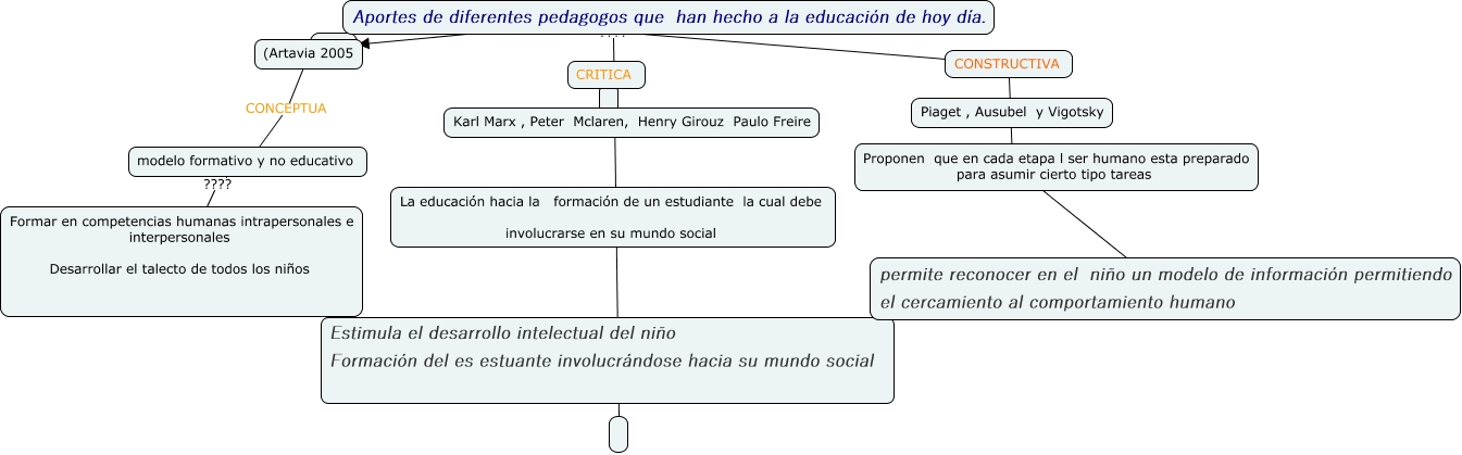 Este Cmap, tiene información relacionada con: TEORIAS PEDAGOGOS, (Artavia 2005 CONCEPTUA modelo formativo y no educativo, Karl Marx , Peter Mclaren, Henry Girouz Paulo Freire ????, CONSTRUCTIVA ???? permite reconocer en el niño un modelo de información permitiendo el cercamiento al comportamiento humano, Aportes de diferentes pedagogos que han hecho a la educación de hoy día. ???? ????, CONSTRUCTIVA ????, modelo formativo y no educativo ???? Formar en competencias humanas intrapersonales e interpersonales Desarrollar el talecto de todos los niños