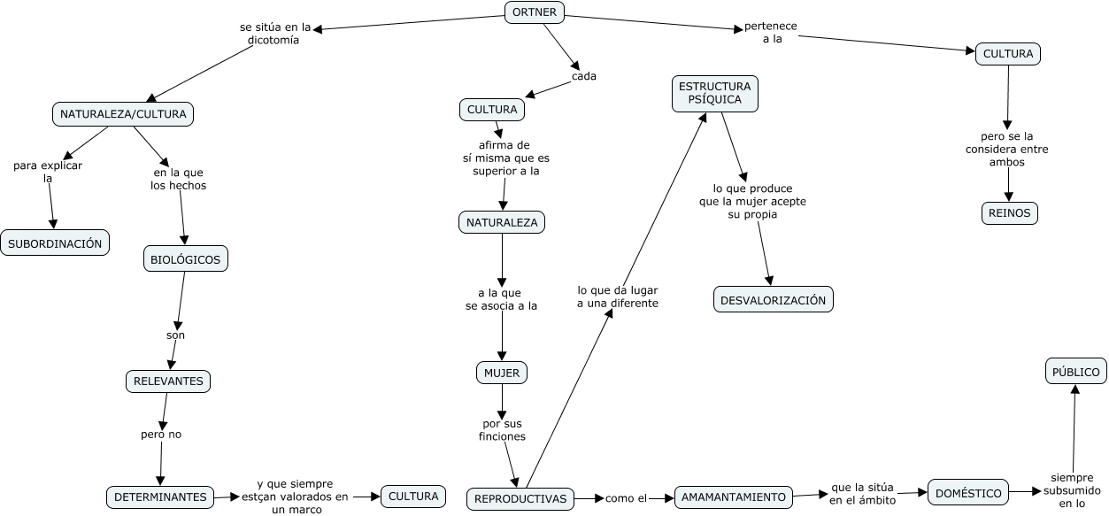 Este Cmap, tiene información relacionada con: C6Ortner, MUJER por sus finciones REPRODUCTIVAS, BIOLÓGICOS son RELEVANTES, ORTNER pertenece a la CULTURA, ORTNER cada CULTURA, CULTURA afirma de sí misma que es superior a la NATURALEZA, ORTNER se sitúa en la dicotomía NATURALEZA/CULTURA, ESTRUCTURA PSÍQUICA lo que produce que la mujer acepte su propia DESVALORIZACIÓN, CULTURA pero se la considera entre ambos REINOS, NATURALEZA a la que se asocia a la MUJER, AMAMANTAMIENTO que la sitúa en el ámbito DOMÉSTICO, NATURALEZA/CULTURA para explicar la SUBORDINACIÓN, DOMÉSTICO siempre subsumido en lo PÚBLICO, DETERMINANTES y que siempre estçan valorados en un marco CULTURA, REPRODUCTIVAS lo que da lugar a una diferente ESTRUCTURA PSÍQUICA, RELEVANTES pero no DETERMINANTES, NATURALEZA/CULTURA en la que los hechos BIOLÓGICOS, REPRODUCTIVAS como el AMAMANTAMIENTO