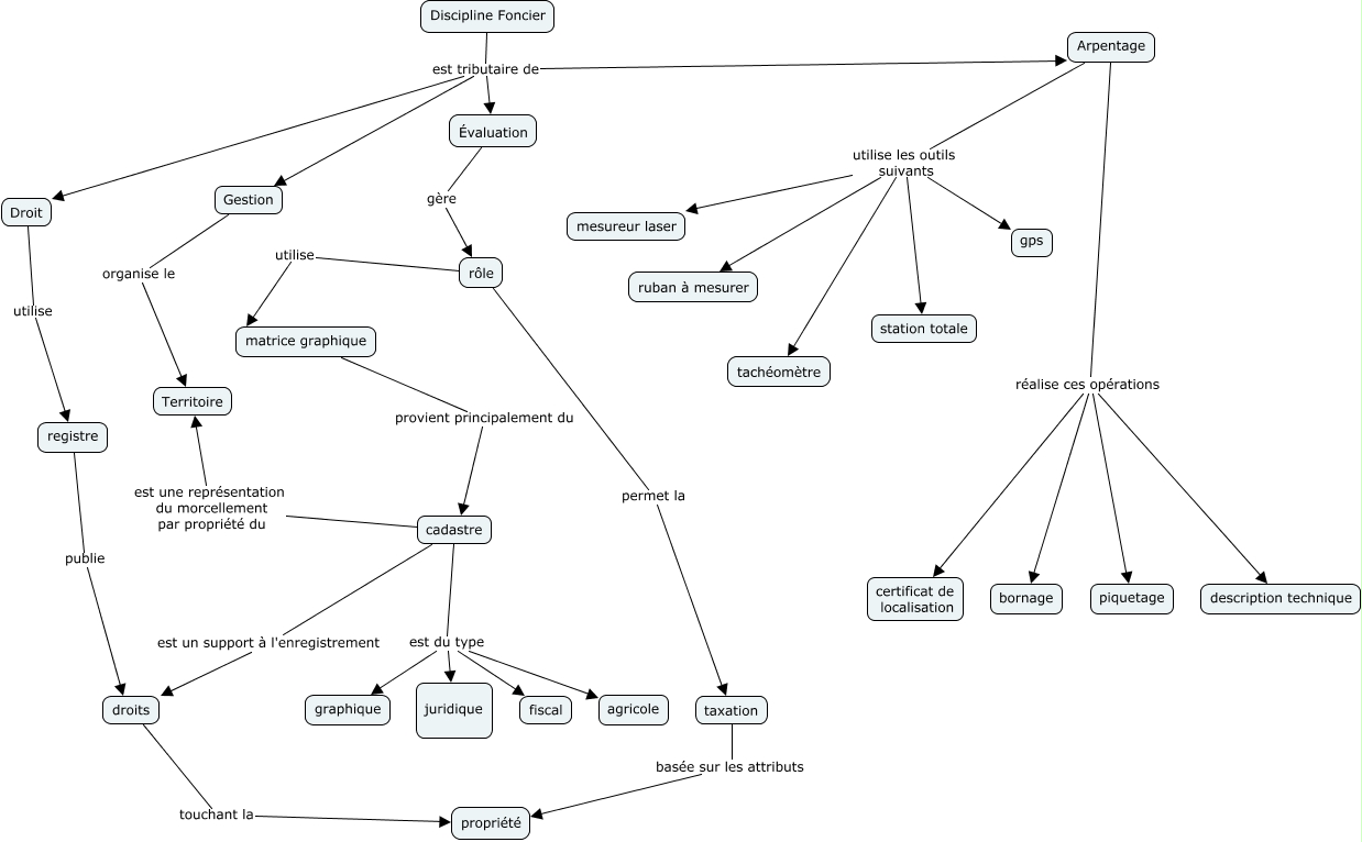 Cette carte de concepts créée avec IHMC CmapTools traite de: Foncier, taxation basée sur les attributs propriété, Arpentage réalise ces opérations bornage, Arpentage utilise les outils suivants gps, Discipline Foncier est tributaire de Gestion, cadastre est du type agricole, cadastre est du type juridique, cadastre est du type fiscal, Arpentage utilise les outils suivants ruban à mesurer, Droit utilise registre, rôle utilise matrice graphique, Arpentage réalise ces opérations piquetage, droits touchant la propriété, Discipline Foncier est tributaire de Arpentage, Arpentage réalise ces opérations description technique, rôle permet la taxation, cadastre est du type graphique, cadastre est une représentation du morcellement par propriété du Territoire, Discipline Foncier est tributaire de Droit, Gestion organise le Territoire, registre publie droits