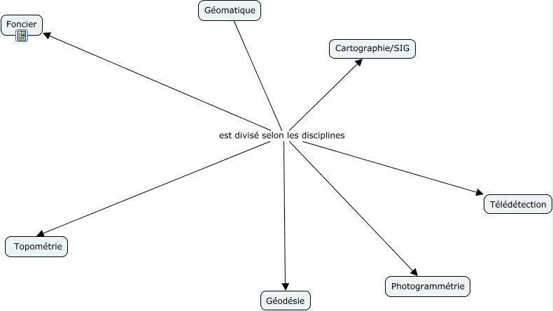 Cette carte de concepts créée avec IHMC CmapTools traite de: la Géomatique, Géomatique est divisé selon les disciplines Photogrammétrie, Géomatique est divisé selon les disciplines Géodésie, Géomatique est divisé selon les disciplines Cartographie/SIG, Géomatique est divisé selon les disciplines Foncier, Géomatique est divisé selon les disciplines Topométrie, Géomatique est divisé selon les disciplines Télédétection