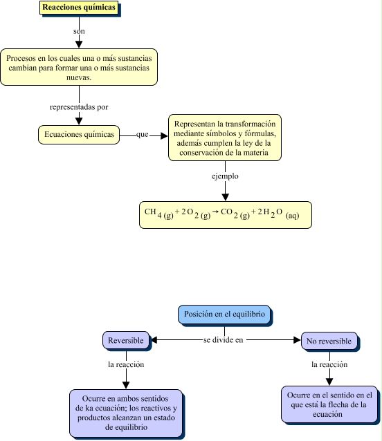 Este Cmap, tiene información relacionada con: Reacciones químicas, Reacciones químicas son Procesos en los cuales una o más sustancias cambian para formar una o más sustancias nuevas., Posición en el equilibrio se divide en Reversible, Reversible la reacción Ocurre en ambos sentidos de ka ecuación; los reactivos y productos alcanzan un estado de equilibrio, Posición en el equilibrio se divide en No reversible, No reversible la reacción Ocurre en el sentido en el que está la flecha de la ecuación, Representan la transformación mediante símbolos y fórmulas, además cumplen la ley de la conservación de la materia ejemplo <math xmlns="http://www.w3.org/1998/Math/MathML"> <mmultiscripts> <mtext> CH </mtext> <mtext> 4 (g) </mtext> <none/> </mmultiscripts> <mtext> + 2 </mtext> <mmultiscripts> <mtext> O </mtext> <mtext> 2 (g) </mtext> <none/> </mmultiscripts> <mtext> → </mtext> <mmultiscripts> <mtext> CO </mtext> <mtext> 2 (g) </mtext> <none/> </mmultiscripts> <mtext> + 2 </mtext> <mmultiscripts> <mtext> H </mtext> <mtext> 2 </mtext> <none/> </mmultiscripts> <mmultiscripts> <mtext> O </mtext> <mtext> (aq) </mtext> <none/> </mmultiscripts> <mmultiscripts> <mtext> </mtext> <mtext> </mtext> <none/> </mmultiscripts> </math>, Ecuaciones químicas que Representan la transformación mediante símbolos y fórmulas, además cumplen la ley de la conservación de la materia, Procesos en los cuales una o más sustancias cambian para formar una o más sustancias nuevas. representadas por Ecuaciones químicas