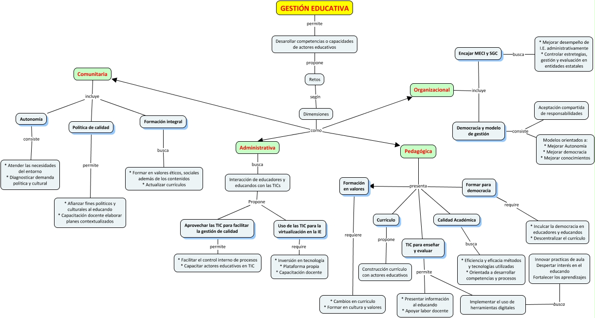 Este Cmap, tiene información relacionada con: Gestión Educativa, Desarollar competencias o capacidades de actores educativos propone Retos, Pedagógica presenta Currículo, Formación en valores requiere * Cambios en curriculo * Formar en cultura y valores, Democracia y modelo de gestión consiste Aceptación compartida de responsabilidades, Dimensiones como Administrativa, Comunitaria incluye Autonomía, Comunitaria incluye Política de calidad, Formar para democracia require * Inculcar la democracia en educadores y educandos * Descentralizar el currículo, Pedagógica presenta Calidad Académica, Aprovechar las TIC para facilitar la gestión de calidad permite * Facilitar el control interno de procesos * Capacitar actores educativos en TIC, Dimensiones como Pedagógica, Uso de las TIC para la virtualización en la IE require * Inversión en tecnología * Plataforma propia * Capacitación docente, Pedagógica presenta Formar para democracia, Organizacional incluye Encajar MECI y SGC, GESTIÓN EDUCATIVA permite Desarollar competencias o capacidades de actores educativos, Interacción de educadores y educandos con las TICs Propone Uso de las TIC para la virtualización en la IE, Pedagógica presenta TIC para enseñar y evaluar, Organizacional incluye Democracia y modelo de gestión, TIC para enseñar y evaluar permite * Presentar información al educando * Apoyar labor docente, Autonomía consiste * Atender las necesidades del entorno * Diagnosticar demanda politica y cultural