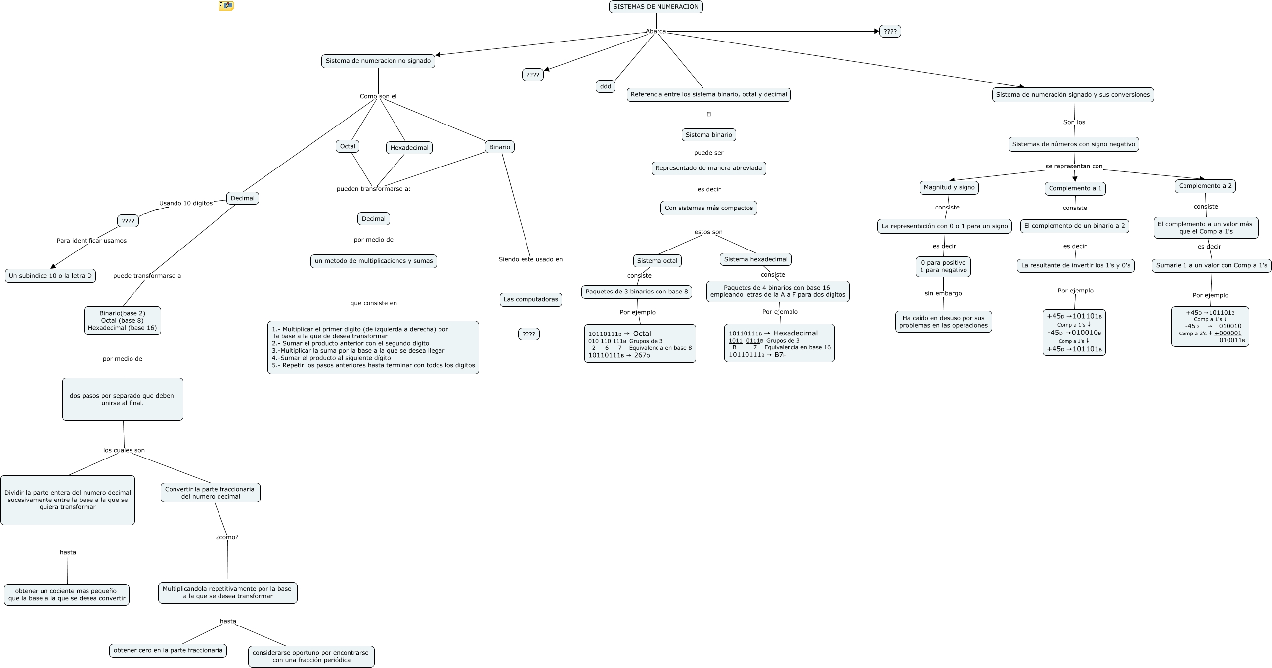 Este Cmap, tiene información relacionada con: PRUEBA UNO-dos, El complemento de un binario a 2 es decir La resultante de invertir los 1's y 0's, Sistemas de números con signo negativo se representan con Complemento a 2, Complemento a 1 consiste El complemento de un binario a 2, Hexadecimal pueden transformarse a: Decimal, SISTEMAS DE NUMERACION Abarca ????, El complemento a un valor más que el Comp a 1's es decir Sumarle 1 a un valor con Comp a 1's, Complemento a 2 consiste El complemento a un valor más que el Comp a 1's, ???? Para identificar usamos Un subindice 10 o la letra D, Paquetes de 3 binarios con base 8 Por ejemplo 10110111B → Octal 010 110 111B Grupos de 3 2 6 7 Equivalencia en base 8 10110111B → 267O, La resultante de invertir los 1's y 0's Por ejemplo +45D →101101B Comp a 1's ↓ -45D →010010B Comp a 1's ↓ +45D →101101B, Sistemas de números con signo negativo se representan con Complemento a 1, La representación con 0 o 1 para un signo es decir 0 para positivo 1 para negativo, Sistema de numeración signado y sus conversiones Son los Sistemas de números con signo negativo, Paquetes de 4 binarios con base 16 empleando letras de la A a F para dos dígitos Por ejemplo 10110111B → Hexadecimal 1011 0111B Grupos de 3 B 7 Equivalencia en base 16 10110111B → B7H, 0 para positivo 1 para negativo sin embargo Ha caído en desuso por sus problemas en las operaciones, Sistema octal consiste Paquetes de 3 binarios con base 8, SISTEMAS DE NUMERACION Abarca ddd, Magnitud y signo consiste La representación con 0 o 1 para un signo, Dividir la parte entera del numero decimal sucesivamente entre la base a la que se quiera transformar hasta obtener un cociente mas pequeño que la base a la que se desea convertir, SISTEMAS DE NUMERACION Abarca Sistema de numeracion no signado
