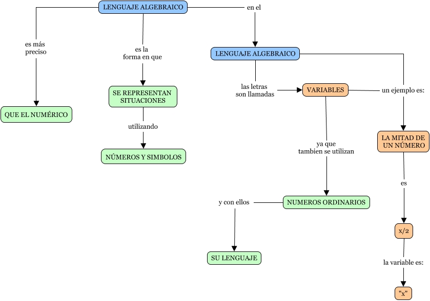 Este Cmap, tiene información relacionada con: Lenguaje algebraico, VARIABLES un ejemplo es: LA MITAD DE UN NÚMERO, SE REPRESENTAN SITUACIONES utilizando NÚMEROS Y SIMBOLOS, LENGUAJE ALGEBRAICO es la forma en que SE REPRESENTAN SITUACIONES, x/2 la variable es: "x", LENGUAJE ALGEBRAICO un ejemplo es: LA MITAD DE UN NÚMERO, NUMEROS ORDINARIOS y con ellos SU LENGUAJE, LENGUAJE ALGEBRAICO en el LENGUAJE ALGEBRAICO, VARIABLES ya que tambien se utilizan NUMEROS ORDINARIOS, LA MITAD DE UN NÚMERO es x/2, LENGUAJE ALGEBRAICO las letras son llamadas VARIABLES, LENGUAJE ALGEBRAICO es más preciso QUE EL NUMÉRICO