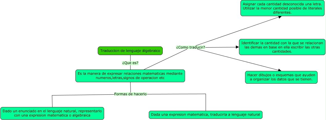 This Concept Map, created with IHMC CmapTools, has information related to: Mapa 3, Es la manera de expresar relaciones matematicas mediante numeros,letras,signos de operacion etc ¿Como traducir? Asignar cada cantidad desconocida una letra. Utilizar la menor cantidad posible de literales diferentes., Es la manera de expresar relaciones matematicas mediante numeros,letras,signos de operacion etc Formas de hacerlo Dada una expresion matematica, traducirla a lenguaje natural, Es la manera de expresar relaciones matematicas mediante numeros,letras,signos de operacion etc Formas de hacerlo Dado un enunciado en el lenguaje natural, representarlo con una expresion matematica o algebraica, Es la manera de expresar relaciones matematicas mediante numeros,letras,signos de operacion etc ¿Como traducir? Identificar la cantidad con la que se relacionan las demas en base en ella escribir las otras cantidades., Es la manera de expresar relaciones matematicas mediante numeros,letras,signos de operacion etc ¿Como traducir? Hacer dibujos o esquemas que ayuden a organizar los datos que se tienen., Traduccion de lenguaje álgebraico ¿Que es? Es la manera de expresar relaciones matematicas mediante numeros,letras,signos de operacion etc