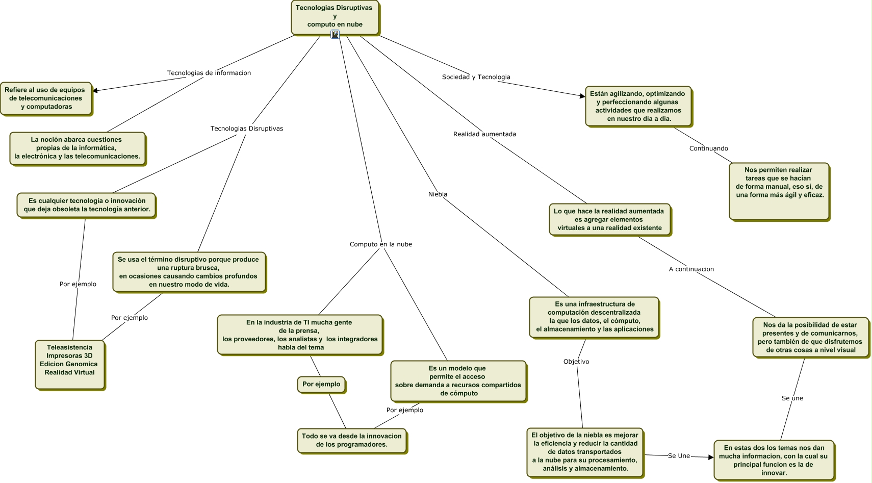 Este Cmap, tiene información relacionada con: Mapa conceptual, En la industria de TI mucha gente de la prensa, los proveedores, los analistas y los integradores habla del tema ???? Todo se va desde la innovacion de los programadores., Tecnologias Disruptivas y computo en nube Realidad aumentada Lo que hace la realidad aumentada es agregar elementos virtuales a una realidad existente, Tecnologias Disruptivas y computo en nube Tecnologias de informacion La noción abarca cuestiones propias de la informática, la electrónica y las telecomunicaciones., Lo que hace la realidad aumentada es agregar elementos virtuales a una realidad existente A continuacion Nos da la posibilidad de estar presentes y de comunicarnos, pero también de que disfrutemos de otras cosas a nivel visual, Tecnologias Disruptivas y computo en nube Tecnologias de informacion Refiere al uso de equipos de telecomunicaciones y computadoras, Es una infraestructura de computación descentralizada la que los datos, el cómputo, el almacenamiento y las aplicaciones Objetivo El objetivo de la niebla es mejorar la eficiencia y reducir la cantidad de datos transportados a la nube para su procesamiento, análisis y almacenamiento., Se usa el término disruptivo porque produce una ruptura brusca, en ocasiones causando cambios profundos en nuestro modo de vida. Por ejemplo Teleasistencia Impresoras 3D Edicion Genomica Realidad Virtual, Están agilizando, optimizando y perfeccionando algunas actividades que realizamos en nuestro día a día. Continuando Nos permiten realizar tareas que se hacían de forma manual, eso sí, de una forma más ágil y eficaz., Es un modelo que permite el acceso sobre demanda a recursos compartidos de cómputo Por ejemplo Todo se va desde la innovacion de los programadores., El objetivo de la niebla es mejorar la eficiencia y reducir la cantidad de datos transportados a la nube para su procesamiento, análisis y almacenamiento. Se Une En estas dos los temas nos dan mucha informacion, con la cual su principal funcion es la de innovar., Tecnologias Disruptivas y computo en nube Sociedad y Tecnologia Están agilizando, optimizando y perfeccionando algunas actividades que realizamos en nuestro día a día., Tecnologias Disruptivas y computo en nube Niebla Es una infraestructura de computación descentralizada la que los datos, el cómputo, el almacenamiento y las aplicaciones, Tecnologias Disruptivas y computo en nube Computo en la nube En la industria de TI mucha gente de la prensa, los proveedores, los analistas y los integradores habla del tema, Nos da la posibilidad de estar presentes y de comunicarnos, pero también de que disfrutemos de otras cosas a nivel visual Se une En estas dos los temas nos dan mucha informacion, con la cual su principal funcion es la de innovar., Tecnologias Disruptivas y computo en nube Computo en la nube Es un modelo que permite el acceso sobre demanda a recursos compartidos de cómputo, Tecnologias Disruptivas y computo en nube Tecnologias Disruptivas Se usa el término disruptivo porque produce una ruptura brusca, en ocasiones causando cambios profundos en nuestro modo de vida., Es cualquier tecnología o innovación que deja obsoleta la tecnología anterior. Por ejemplo Teleasistencia Impresoras 3D Edicion Genomica Realidad Virtual, Tecnologias Disruptivas y computo en nube Tecnologias Disruptivas Es cualquier tecnología o innovación que deja obsoleta la tecnología anterior.