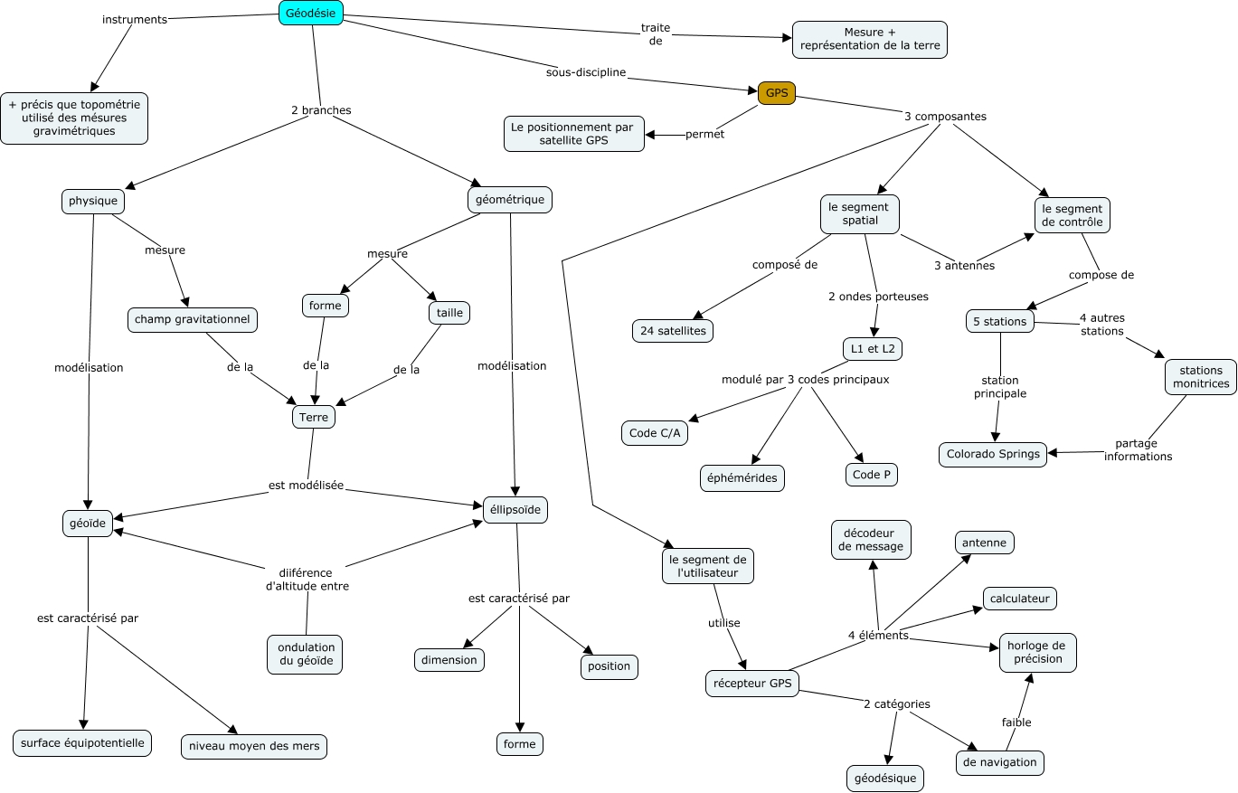 Cette carte de concepts créée avec IHMC CmapTools traite de: géodésie_xxx, le segment de contrôle compose de 5 stations, GPS 3 composantes le segment spatial, géométrique modélisation éllipsoïde, géométrique mesure taille, 5 stations 4 autres stations stations monitrices, Terre est modélisée géoïde, le segment spatial 2 ondes porteuses L1 et L2, le segment de l'utilisateur utilise récepteur GPS, récepteur GPS 2 catégories géodésique, géoïde est caractérisé par surface équipotentielle, physique modélisation géoïde, L1 et L2 modulé par 3 codes principaux Code P, taille de la Terre, stations monitrices partage informations Colorado Springs, récepteur GPS 4 éléments antenne, récepteur GPS 4 éléments décodeur de message, Terre est modélisée éllipsoïde, L1 et L2 modulé par 3 codes principaux Code C/A, GPS 3 composantes le segment de contrôle, Géodésie traite de Mesure + représentation de la terre