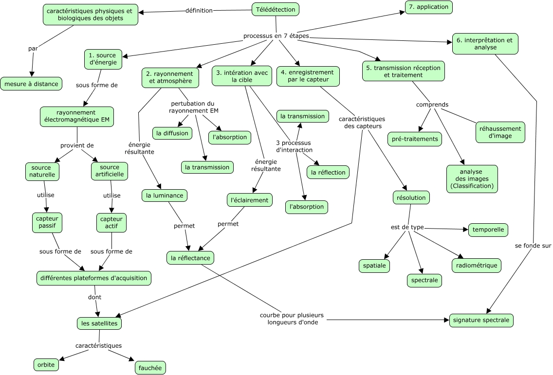 Cette carte de concepts créée avec IHMC CmapTools traite de: télédétection_xxx, différentes plateformes d'acquisition dont les satellites, résolution est de type spectrale, 3. intération avec la cible 3 processus d'interaction l'absorption, Télédétection processus en 7 étapes 1. source d'énergie, 5. transmission réception et traitement comprends réhaussement d'image, résolution est de type spatiale, caractéristiques physiques et biologiques des objets par mesure à distance, Télédétection processus en 7 étapes 4. enregistrement par le capteur, résolution est de type temporelle, 3. intération avec la cible 3 processus d'interaction la transmission, capteur actif sous forme de différentes plateformes d'acquisition, Télédétection processus en 7 étapes 7. application, l'éclairement permet la réflectance, Télédétection définition caractéristiques physiques et biologiques des objets, 2. rayonnement et atmosphère pertubation du rayonnement EM l'absorption, 4. enregistrement par le capteur caractéristiques des capteurs les satellites, Télédétection processus en 7 étapes 3. intération avec la cible, 5. transmission réception et traitement comprends analyse des images (Classification), capteur passif sous forme de différentes plateformes d'acquisition, source naturelle utilise capteur passif