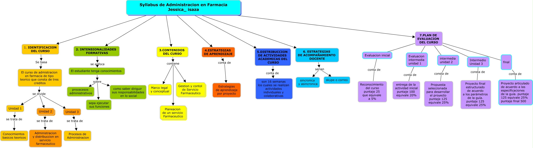 Este Cmap, tiene información relacionada con: SYLLABUS DE ADMINISTRACION EN FARMACIA, Evaluacion inicial conta de Reconocimiento del curso puntaje 25 que equivale a 5%, Syllabus de Administracion en Farmacia Jessica_ isaza ???? 7.PLAN DE EVALUACION DEL CURSO, El estudiante tenga conocimientos sobre procecesos administrativos, Syllabus de Administracion en Farmacia Jessica_ isaza ???? 4.ESTRATEGIAS DE APRENDIZAJE, 6. ESTRATEGIAS DE ACOMPAÑAMIENTO DOCENTE serian skype o correo, 4.ESTRATEGIAS DE APRENDIZAJE conta de Estrategias de aprendizaje por proyecto, Unidad 2 se trata de Administracion y distribuccion en servicio farmaceutico, El estudiante tenga conocimientos sobre como saber diriguir sus responsabilidades en lo social, Syllabus de Administracion en Farmacia Jessica_ isaza ???? 6. ESTRATEGIAS DE ACOMPAÑAMIENTO DOCENTE, final conta de Proyecto articulado de acuerdo a las especificaciones de la guía. puntaje 125 equivale 25% puntaje final 500, Unidad 3 se trata de Procesos de Administracion, Intermedio Unidad 3 consta de Proyecto final estructurado de acuerdo a los parámetros de la guía. puntaje 125 equivale 25%, El curso de admistracion en farmacia de tipo teorico que consta de tres creditos se divide Unidad 2, 3.CONTENIDOS DEL CURSO contiene Marco legal y conceptual, 6. ESTRATEGIAS DE ACOMPAÑAMIENTO DOCENTE serian sincronica y asincronica, Unidad 1 se trata de Conocimientos basicos teoricos, 1. IDENTIFICACION DEL CURSO Se basa El curso de admistracion en farmacia de tipo teorico que consta de tres creditos, 7.PLAN DE EVALUACION DEL CURSO ???? final, El curso de admistracion en farmacia de tipo teorico que consta de tres creditos se divide Unidad 3, 2. INTENSIONALIDADES FORMATIVAS se enfoca El estudiante tenga conocimientos