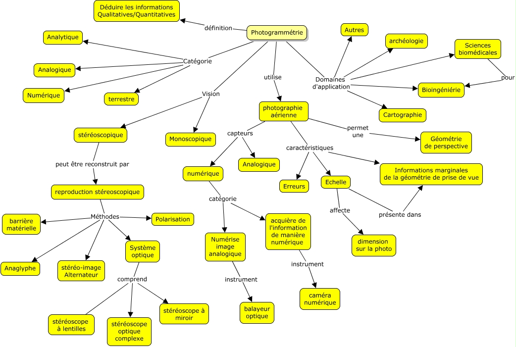 Cette carte de concepts créée avec IHMC CmapTools traite de: Sans titre 1, Echelle affecte dimension sur la photo, photographie aérienne capteurs Analogique, Système optique comprend stéréoscope à miroir, photographie aérienne permet une Géométrie de perspective, reproduction stéreoscopique Méthodes Polarisation, Système optique comprend stéréoscope optique complexe, Photogrammétrie Catégorie Analogique, Photogrammétrie Domaines d'application Cartographie, reproduction stéreoscopique Méthodes barrière matérielle, Photogrammétrie définition Déduire les informations Qualitatives/Quantitatives, Photogrammétrie Domaines d'application Sciences biomédicales, Photogrammétrie Catégorie Numérique, reproduction stéreoscopique Méthodes Anaglyphe, Photogrammétrie Domaines d'application Autres, numérique catégorie acquière de l'information de manière numérique, reproduction stéreoscopique Méthodes Système optique, Numérise image analogique instrument balayeur optique, reproduction stéreoscopique Méthodes stéréo-image Alternateur, acquière de l'information de manière numérique instrument caméra numérique, Photogrammétrie Catégorie Analytique