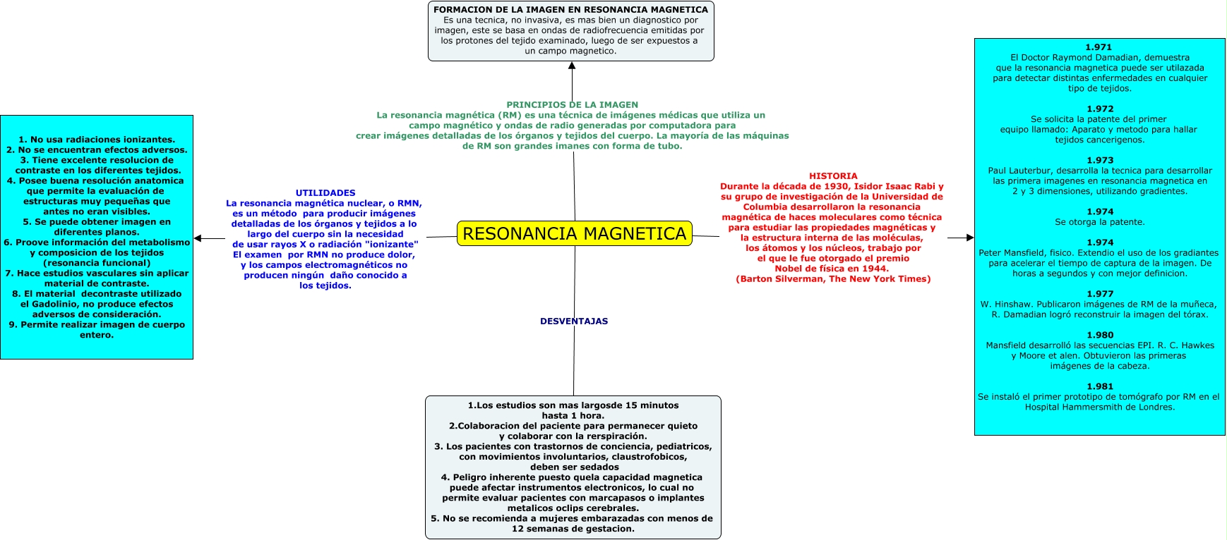 Este Cmap, tiene información relacionada con: SEMIOLOGIA - Resonancia magnética, RESONANCIA MAGNETICA PRINCIPIOS DE LA IMAGEN La resonancia magnética (RM) es una técnica de imágenes médicas que utiliza un campo magnético y ondas de radio generadas por computadora para crear imágenes detalladas de los órganos y tejidos del cuerpo. La mayoría de las máquinas de RM son grandes imanes con forma de tubo. FORMACION DE LA IMAGEN EN RESONANCIA MAGNETICA Es una tecnica, no invasiva, es mas bien un diagnostico por imagen, este se basa en ondas de radiofrecuencia emitidas por los protones del tejido examinado, luego de ser expuestos a un campo magnetico., RESONANCIA MAGNETICA HISTORIA Durante la década de 1930, Isidor Isaac Rabi y su grupo de investigación de la Universidad de Columbia desarrollaron la resonancia magnética de haces moleculares como técnica para estudiar las propiedades magnéticas y la estructura interna de las moléculas, los átomos y los núcleos, trabajo por el que le fue otorgado el premio Nobel de física en 1944. (Barton Silverman, The New York Times) 1.971 El Doctor Raymond Damadian, demuestra que la resonancia magnetica puede ser utilazada para detectar distintas enfermedades en cualquier tipo de tejidos. 1.972 Se solicita la patente del primer equipo llamado: Aparato y metodo para hallar tejidos cancerigenos. 1.973 Paul Lauterbur, desarrolla la tecnica para desarrollar las primera imagenes en resonancia magnetica en 2 y 3 dimensiones, utilizando gradientes. 1.974 Se otorga la patente. 1.974 Peter Mansfield, fisico. Extendio el uso de los gradiantes para acelerar el tiempo de captura de la imagen. De horas a segundos y con mejor definicion. 1.977 W. Hinshaw. Publicaron imágenes de RM de la muñeca, R. Damadian logró reconstruir la imagen del tórax. 1.980 Mansfield desarrolló las secuencias EPI. R. C. Hawkes y Moore et alen. Obtuvieron las primeras imágenes de la cabeza. 1.981 Se instaló el primer prototipo de tomógrafo por RM en el Hospital Hammersmith de Londres., RESONANCIA MAGNETICA UTILIDADES La resonancia magnética nuclear, o RMN, es un método para producir imágenes detalladas de los órganos y tejidos a lo largo del cuerpo sin la necesidad de usar rayos X o radiación "ionizante" El examen por RMN no produce dolor, y los campos electromagnéticos no producen ningún daño conocido a los tejidos. 1. No usa radiaciones ionizantes. 2. No se encuentran efectos adversos. 3. Tiene excelente resolucion de contraste en los diferentes tejidos. 4. Posee buena resolución anatomica que permite la evaluación de estructuras muy pequeñas que antes no eran visibles. 5. Se puede obtener imagen en diferentes planos. 6. Proove información del metabolismo y composicion de los tejidos (resonancia funcional) 7. Hace estudios vasculares sin aplicar material de contraste. 8. El material decontraste utilizado el Gadolinio, no produce efectos adversos de consideración. 9. Permite realizar imagen de cuerpo entero., RESONANCIA MAGNETICA DESVENTAJAS 1.Los estudios son mas largosde 15 minutos hasta 1 hora. 2.Colaboracion del paciente para permanecer quieto y colaborar con la rerspiración. 3. Los pacientes con trastornos de conciencia, pediatricos, con movimientos involuntarios, claustrofobicos, deben ser sedados 4. Peligro inherente puesto quela capacidad magnetica puede afectar instrumentos electronicos, lo cual no permite evaluar pacientes con marcapasos o implantes metalicos oclips cerebrales. 5. No se recomienda a mujeres embarazadas con menos de 12 semanas de gestacion.