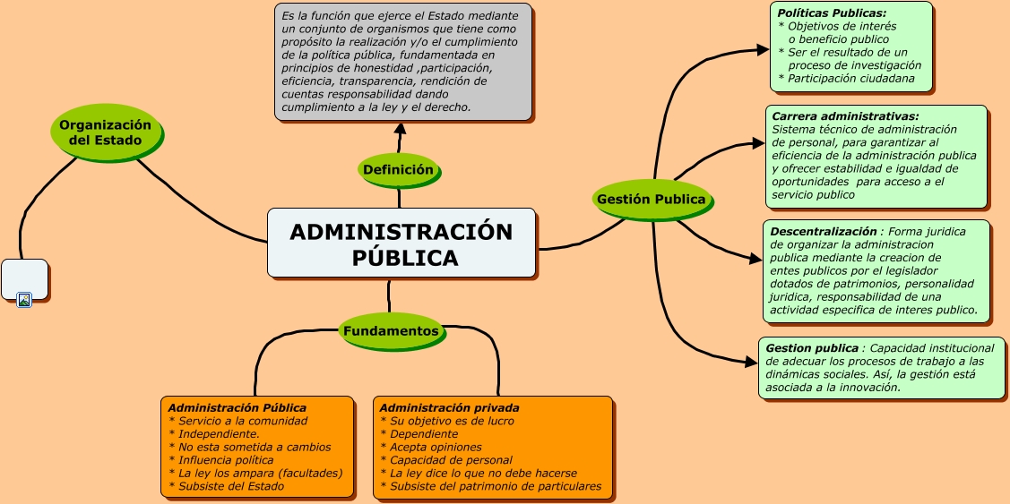 Este Cmap, tiene información relacionada con: Administración Publica, ADMINISTRACIÓN PÚBLICA Gestión Publica Carrera administrativas: Sistema técnico de administración de personal, para garantizar al eficiencia de la administración publica y ofrecer estabilidad e igualdad de oportunidades para acceso a el servicio publico, ADMINISTRACIÓN PÚBLICA Fundamentos Administración privada * Su objetivo es de lucro * Dependiente * Acepta opiniones * Capacidad de personal * La ley dice lo que no debe hacerse * Subsiste del patrimonio de particulares, ADMINISTRACIÓN PÚBLICA Organización del Estado, ADMINISTRACIÓN PÚBLICA Gestión Publica Políticas Publicas: * Objetivos de interés o beneficio publico * Ser el resultado de un proceso de investigación * Participación ciudadana, ADMINISTRACIÓN PÚBLICA Definición Es la función que ejerce el Estado mediante un conjunto de organismos que tiene como propósito la realización y/o el cumplimiento de la política pública, fundamentada en principios de honestidad ,participación, eficiencia, transparencia, rendición de cuentas responsabilidad dando cumplimiento a la ley y el derecho., ADMINISTRACIÓN PÚBLICA Gestión Publica Gestion publica: Capacidad institucional de adecuar los procesos de trabajo a las dinámicas sociales. Así, la gestión está asociada a la innovación., ADMINISTRACIÓN PÚBLICA Gestión Publica Descentralización: Forma juridica de organizar la administracion publica mediante la creacion de entes publicos por el legislador dotados de patrimonios, personalidad juridica, responsabilidad de una actividad especifica de interes publico., ADMINISTRACIÓN PÚBLICA Fundamentos Administración Pública * Servicio a la comunidad * Independiente. * No esta sometida a cambios * Influencia política * La ley los ampara (facultades) * Subsiste del Estado