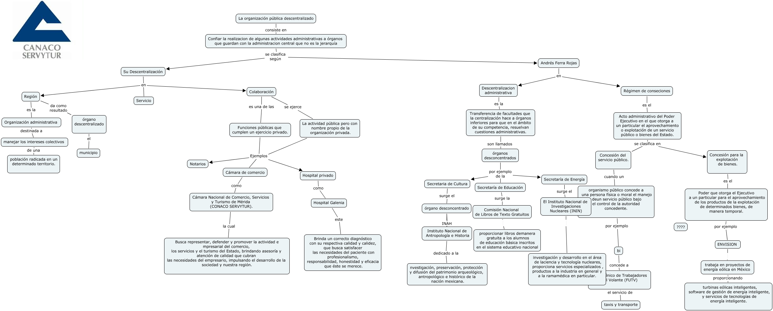 Este Cmap, tiene información relacionada con: Sin Título 1, Poder que otorga el Ejecutivo a un particular para el aprovechamiento de los productos de la explotación de determinados bienes, de manera temporal. por ejemplo ENVISION, Descentralizacion administrativa es la Transferencia de facultades que la centralización hace a órganos inferiores para que en el ámbito de su competencia, resuelvan cuestiones administrativas., Secretaria de Cultura surge el órgano desconcentrado, órganos desconcentrados por ejemplo de la Secretaría de Educación, Su Descentralización en Colaboración, Frente Único de Trabajadores del Volante (FUTV) el servicio de taxis y transporte, Instituto Nacional de Antropología e Historia dedicado a la nvestigación, preservación, protección y difusión del patrimonio arqueológico, antropológico e histórico de la nación mexicana., Confiar la realizacion de algunas actividades administrativas a órganos que guardan con la administracion central que no es la jerarquía se clasifica según Andrés Ferra Rojas, Cámara Nacional de Comercio, Servicios y Turismo de Mérida (CONACO SERVYTUR). la cual Busca representar, defender y promover la actividad e mpresarial del comercio, los servicios y el turismo del Estado, brindando asesoría y atención de calidad que cubran las necesidades del empresario, impulsando el desarrollo de la sociedad y nuestra región., La organización pública descentralizado consiste en Confiar la realizacion de algunas actividades administrativas a órganos que guardan con la administracion central que no es la jerarquía, Transferencia de facultades que la centralización hace a órganos inferiores para que en el ámbito de su competencia, resuelvan cuestiones administrativas. son llamados órganos desconcentrados, bi concede a Frente Único de Trabajadores del Volante (FUTV), Confiar la realizacion de algunas actividades administrativas a órganos que guardan con la administracion central que no es la jerarquía se clasifica según Su Descentralización, Hospital privado como Hospital Galenia, ENVISION trabaja en proyectos de energía eólica en México, La actividad pública pero con nombre propio de la organización privada. Ejemplos Notarios, manejar los intereses colectivos de una población radicada en un determinado territorio., Funciones públicas que cumplen un ejercicio privado. Ejemplos Cámara de comercio, Comisión Nacional de Libros de Texto Gratuitos proporcionar libros demanera gratuita a los alumnos de educación básica inscritos en el sistema educativo nacional, Concesión del servicio público. cuando un organismo público concede a una persona física o moral el manejo deun servicio público bajo el control de la autoridad concedente.
