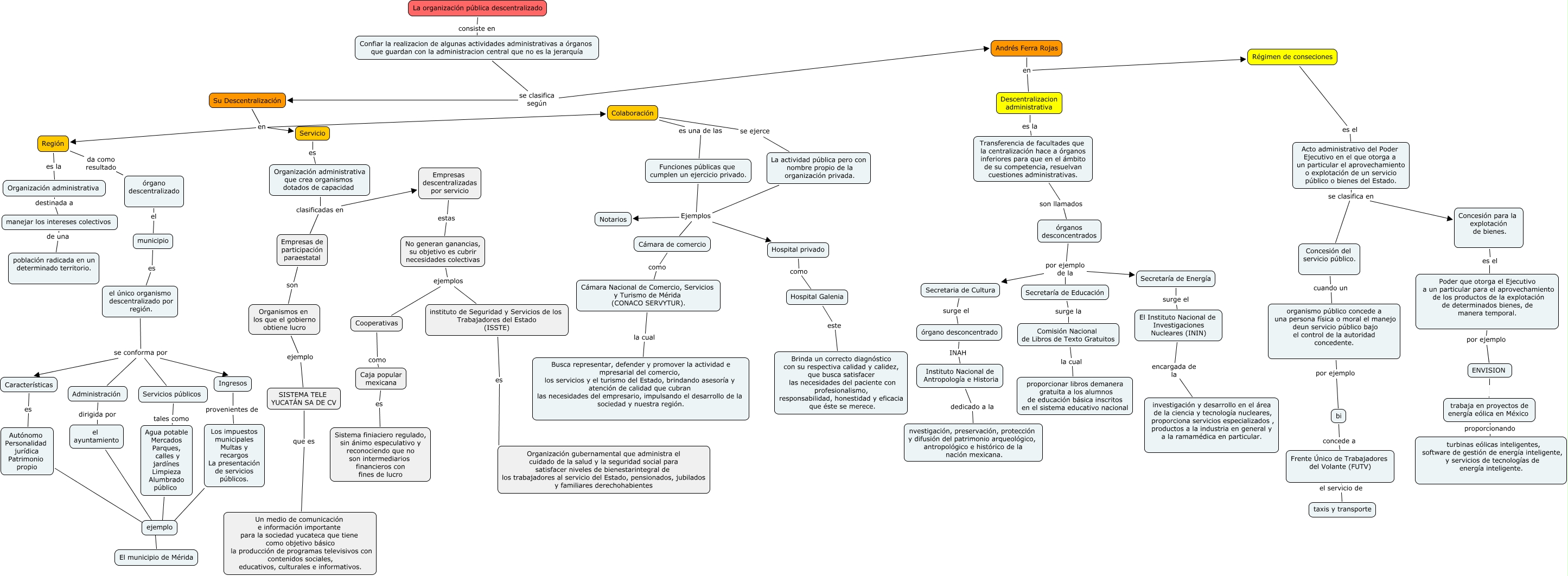 Este Cmap, tiene información relacionada con: Descentralización final, Acto administrativo del Poder Ejecutivo en el que otorga a un particular el aprovechamiento o explotación de un servicio público o bienes del Estado. se clasifica en Concesión del servicio público., Acto administrativo del Poder Ejecutivo en el que otorga a un particular el aprovechamiento o explotación de un servicio público o bienes del Estado. se clasifica en Concesión para la explotación de bienes., Organización administrativa que crea organismos dotados de capacidad clasificadas en Empresas de participación paraestatal, Poder que otorga el Ejecutivo a un particular para el aprovechamiento de los productos de la explotación de determinados bienes, de manera temporal. por ejemplo ENVISION, Su Descentralización en Región, el único organismo descentralizado por región. se conforma por Ingresos, Andrés Ferra Rojas en Descentralizacion administrativa, La actividad pública pero con nombre propio de la organización privada. Ejemplos Notarios, Servicio es Organización administrativa que crea organismos dotados de capacidad, trabaja en proyectos de energía eólica en México proporcionando turbinas eólicas inteligentes, software de gestión de energía inteligente, y servicios de tecnologías de energía inteligente., instituto de Seguridad y Servicios de los Trabajadores del Estado (ISSTE) es Organización gubernamental que administra el cuidado de la salud y la seguridad social para satisfacer niveles de bienestarintegral de los trabajadores al servicio del Estado, pensionados, jubilados y familiares derechohabientes, Caja popular mexicana es Sistema finiaciero regulado, sin ánimo especulativo y reconociendo que no son intermediarios financieros con fines de lucro, Empresas de participación paraestatal son Organismos en los que el gobierno obtiene lucro, Régimen de conseciones es el Acto administrativo del Poder Ejecutivo en el que otorga a un particular el aprovechamiento o explotación de un servicio público o bienes del Estado., el ayuntamiento ???? El municipio de Mérida, Instituto Nacional de Antropología e Historia dedicado a la nvestigación, preservación, protección y difusión del patrimonio arqueológico, antropológico e histórico de la nación mexicana., No generan ganancias, su objetivo es cubrir necesidades colectivas ejemplos Cooperativas, Funciones públicas que cumplen un ejercicio privado. Ejemplos Hospital privado, Los impuestos municipales Multas y recargos La presentación de servicios públicos. ???? ejemplo, Organización administrativa que crea organismos dotados de capacidad clasificadas en Empresas descentralizadas por servicio