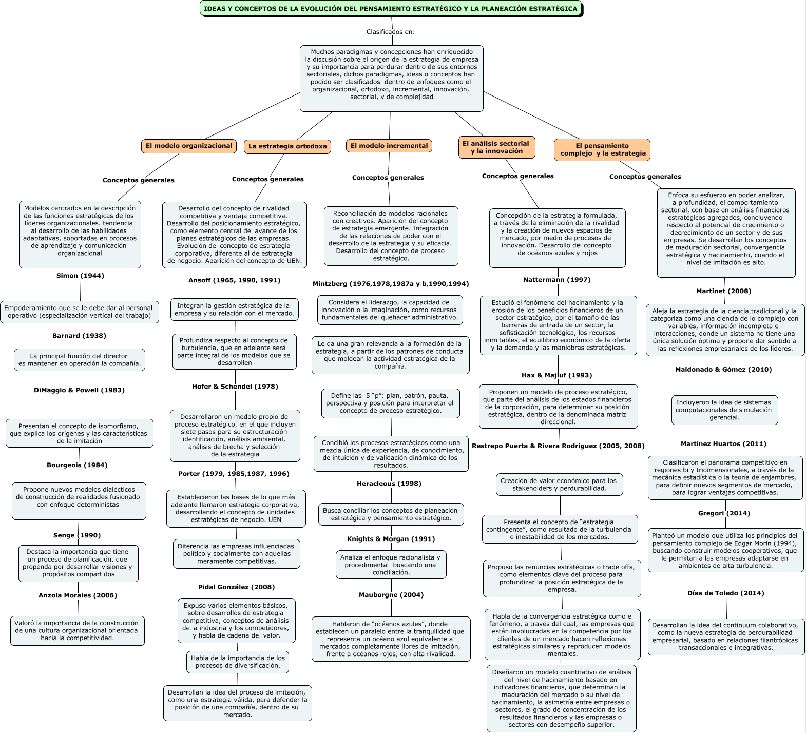 Este Cmap, tiene información relacionada con: Ideas y conceptos de la evolución del P.E. y la P. E, Considera el liderazgo, la capacidad de innovación o la imaginación, como recursos fundamentales del quehacer administrativo. ???? Le da una gran relevancia a la formación de la estrategia, a partir de los patrones de conducta que moldean la actividad estratégica de la compañía., Enfoca su esfuerzo en poder analizar, a profundidad, el comportamiento sectorial, con base en análisis financieros estratégicos agregados, concluyendo respecto al potencial de crecimiento o decrecimiento de un sector y de sus empresas. Se desarrollan los conceptos de maduración sectorial, convergencia estratégica y hacinamiento, cuando el nivel de imitación es alto. Martinet (2008) Aleja la estrategia de la ciencia tradicional y la categoriza como una ciencia de lo complejo con variables, información incompleta e interacciones, donde un sistema no tiene una única solución óptima y propone dar sentido a las reflexiones empresariales de los líderes., El pensamiento complejo y la estrategia Conceptos generales Enfoca su esfuerzo en poder analizar, a profundidad, el comportamiento sectorial, con base en análisis financieros estratégicos agregados, concluyendo respecto al potencial de crecimiento o decrecimiento de un sector y de sus empresas. Se desarrollan los conceptos de maduración sectorial, convergencia estratégica y hacinamiento, cuando el nivel de imitación es alto., Muchos paradigmas y concepciones han enriquecido la discusión sobre el origen de la estrategia de empresa y su importancia para perdurar dentro de sus entornos sectoriales, dichos paradigmas, ideas o conceptos han podido ser clasificados dentro de enfoques como el organizacional, ortodoxo, incremental, innovación, sectorial, y de complejidad ???? El pensamiento complejo y la estrategia, El análisis sectorial y la innovación Conceptos generales Concepción de la estrategia formulada, a través de la eliminación de la rivalidad y la creación de nuevos espacios de mercado, por medio de procesos de innovación. Desarrollo del concepto de océanos azules y rojos, Analiza el enfoque racionalista y procedimental buscando una conciliación. Mauborgne (2004) Hablaron de “océanos azules”, donde establecen un paralelo entre la tranquilidad que representa un océano azul equivalente a mercados completamente libres de imitación, frente a océanos rojos, con alta rivalidad., Planteó un modelo que utiliza los principios del pensamiento complejo de Edgar Morin (1994), buscando construir modelos cooperativos, que le permitan a las empresas adaptarse en ambientes de alta turbulencia. Días de Toledo (2014) Desarrollan la idea del continuum colaborativo, como la nueva estrategia de perdurabilidad empresarial, basado en relaciones filantrópicas transaccionales e integrativas., La principal función del director es mantener en operación la compañía. DiMaggio & Powell (1983) Presentan el concepto de isomorfismo, que explica los orígenes y las características de la imitación, Muchos paradigmas y concepciones han enriquecido la discusión sobre el origen de la estrategia de empresa y su importancia para perdurar dentro de sus entornos sectoriales, dichos paradigmas, ideas o conceptos han podido ser clasificados dentro de enfoques como el organizacional, ortodoxo, incremental, innovación, sectorial, y de complejidad ???? El modelo organizacional, IDEAS Y CONCEPTOS DE LA EVOLUCIÓN DEL PENSAMIENTO ESTRATÉGICO Y LA PLANEACIÓN ESTRATÉGICA Clasificados en: Muchos paradigmas y concepciones han enriquecido la discusión sobre el origen de la estrategia de empresa y su importancia para perdurar dentro de sus entornos sectoriales, dichos paradigmas, ideas o conceptos han podido ser clasificados dentro de enfoques como el organizacional, ortodoxo, incremental, innovación, sectorial, y de complejidad, Desarrollo del concepto de rivalidad competitiva y ventaja competitiva. Desarrollo del posicionamiento estratégico, como elemento central del avance de los planes estratégicos de las empresas. Evolución del concepto de estrategia corporativa, diferente al de estrategia de negocio. Aparición del concepto de UEN. Ansoff (1965, 1990, 1991) Integran la gestión estratégica de la empresa y su relación con el mercado., Expuso varios elementos básicos, sobre desarrollos de estrategia competitiva, conceptos de análisis de la industria y los competidores, y habla de cadena de valor. ???? Habla de la importancia de los procesos de diversificación., Integran la gestión estratégica de la empresa y su relación con el mercado. ???? Profundiza respecto al concepto de turbulencia, que en adelante será parte integral de los modelos que se desarrollen, Habla de la convergencia estratégica como el fenómeno, a través del cual, las empresas que están involucradas en la competencia por los clientes de un mercado hacen reflexiones estratégicas similares y reproducen modelos mentales. ???? Diseñaron un modelo cuantitativo de análisis del nivel de hacinamiento basado en indicadores financieros, que determinan la maduración del mercado o su nivel de hacinamiento, la asimetría entre empresas o sectores, el grado de concentración de los resultados financieros y las empresas o sectores con desempeño superior., Establecieron las bases de lo que más adelante llamaron estrategia corporativa, desarrollando el concepto de unidades estratégicas de negocio. UEN ???? Diferencia las empresas influenciadas político y socialmente con aquellas meramente competitivas., Clasificaron el panorama competitivo en regiones bi y tridimensionales, a través de la mecánica estadística o la teoría de enjambres, para definir nuevos segmentos de mercado, para lograr ventajas competitivas. Gregori (2014) Planteó un modelo que utiliza los principios del pensamiento complejo de Edgar Morin (1994), buscando construir modelos cooperativos, que le permitan a las empr
