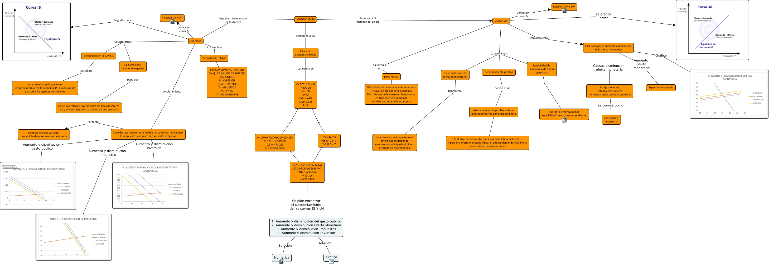 Este Cmap, tiene información relacionada con: Mapa macroeconomia, CURVA LM Caracteristicas Ese equilibrio en el mercado monetario, existe una relación positiva entre el nivel de renta y la demanda de dinero Dado que Si el nivel de renta sube (para una misma tasa de interés y para una oferta monetaria rígida) el público demanda más dinero para realizar más transacciones, 1. Aumento y disminucion del gasto publico 2. Aumento y disminucion Oferta Monetaria 3. Aumento y disminucion Impuestos 4. Aumneto y disminucion Inversion Solucion Numerica, Y= 170+0.7(y-70)+200-20i+150 Y= 520+0.7Y-49-20i 0.3Y= 471-20i Y= 1570-66.6667i ???? 162.5+7i=1570-6606667i 1570-162.5=66.66667i+7i 1407.5=73.6667i i= 19.106 y=296.2443, La curva tiene pendiente negativa Dado que existe una relación inversa entre los tipos de interés real y el nivel de producto o renta en una economía, C= 170+0.9(y-T) I= 200-20i G= 150 T=70 DM= 4y-28i OM= 2600 P =4 IS Y= 170+0.7(y-70)+200-20i+150 Y= 520+0.7Y-49-20i 0.3Y= 471-20i Y= 1570-66.6667i, CURVA IS Su formula es Y= Co+C(Y-T)+ I(r)+G, Esta dada por el aumento o diminucion de la oferta monetarias Grafica, CURVA IS desplazamiento Cabe destacar que en éste modelo, el consumo, lainversion los impuestos y el gasto son variables exógenas, El equilibrio en la curva IS Representa una situación en la que todo lo que se produce en la economía (Y) es consumido por todos los agentes de la misma, Sensibilidad de la demanda de dinero respecto a r si Por tanto a mayor/menor sensibilidad menor/mayor pendiente., ???? ???? 162.5+7i=1570-6606667i 1570-162.5=66.66667i+7i 1407.5=73.6667i i= 19.106 y=296.2443, (OM/P)=DM Donde OM= Cantidad monetaria en la economía. P= Nivel de precios de la economía. DM= Demanda de dinero en la economía. r= Tipo de interés nominal. Y= Nivel de renta de la economía., Ese equilibrio en el mercado monetario Representa una situación en la que todo el dinero que se demanda en una economía, iguala al dinero ofertado en esa economía, Encaje monetario Estado emite valores Aumnetan expectativas economicas se conoce como contraccion monetaria, CURVA LM se grafica como, MODELO IS-LM Representa el mercado del dinero CURVA LM, Cabe destacar que en éste modelo, el consumo, lainversion los impuestos y el gasto son variables exógenas Aumento y disminucion impuestos, Cabe destacar que en éste modelo, el consumo, lainversion los impuestos y el gasto son variables exógenas Aumento y disminucion gasto publico, Esta dada por el aumento o diminucion de la oferta monetarias Causas disminucion oferta monetaria Encaje monetario Estado emite valores Aumnetan expectativas economicas