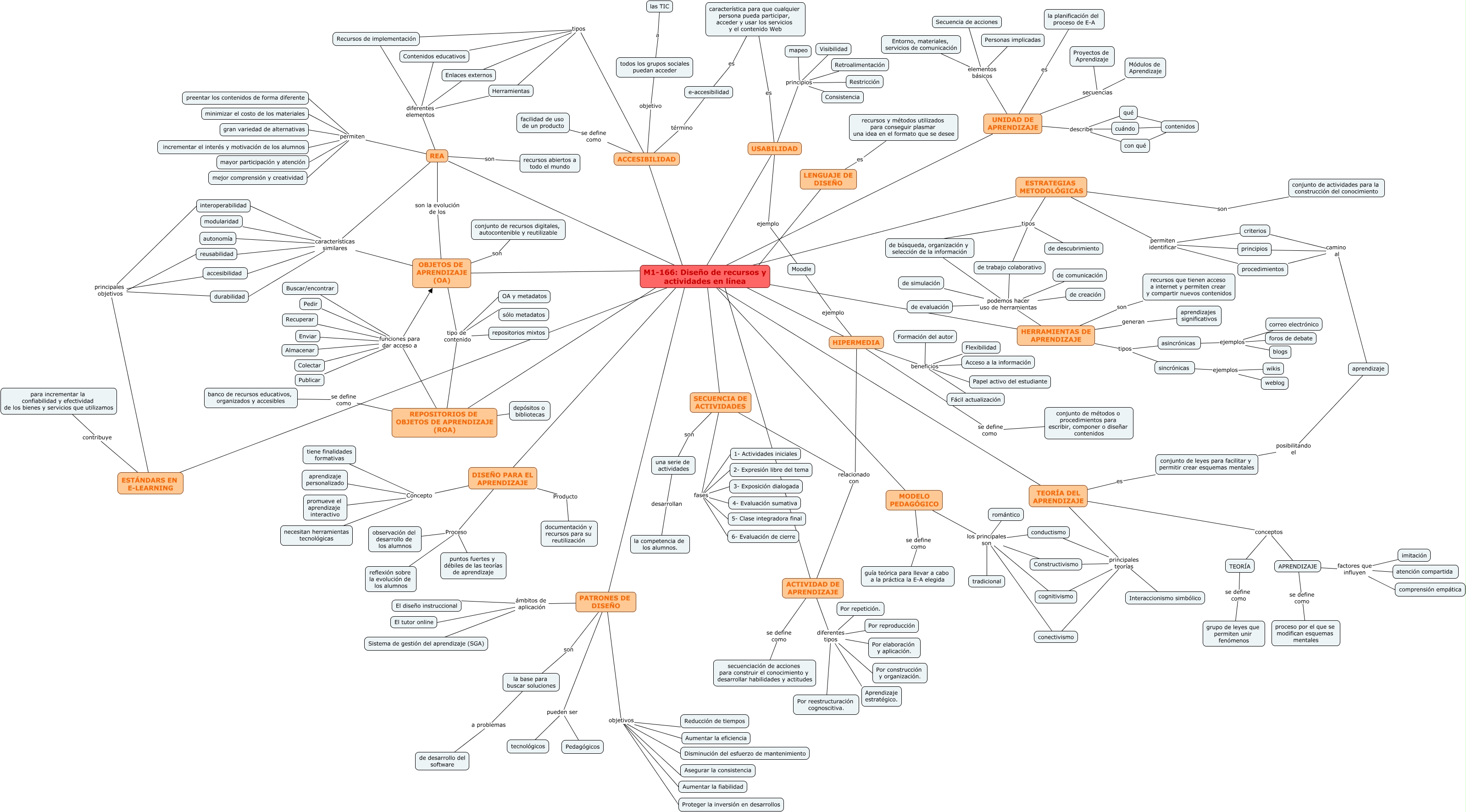 Este Cmap, tiene información relacionada con: m1-166 DEFINICIONES, REA permiten gran variedad de alternativas, OBJETOS DE APRENDIZAJE (OA) características similares accesibilidad, sincrónicas ejemplos weblog, USABILIDAD principios mapeo, ESTRATEGIAS METODOLÓGICAS permiten identificar principios, M1-166: Diseño de recursos y actividades en línea ???? HIPERMEDIA, HERRAMIENTAS DE APRENDIZAJE podemos hacer uso de herramientas de búsqueda, organización y selección de la información, USABILIDAD principios Visibilidad, principios camino al aprendizaje, procedimientos camino al aprendizaje, LENGUAJE DE DISEÑO es recursos y métodos utilizados para conseguir plasmar una idea en el formato que se desee, REA características similares autonomía, M1-166: Diseño de recursos y actividades en línea ???? ACCESIBILIDAD, REA permiten incrementar el interés y motivación de los alumnos, asincrónicas ejemplos correo electrónico, SECUENCIA DE ACTIVIDADES son una serie de actividades, M1-166: Diseño de recursos y actividades en línea ???? ESTÁNDARS EN E-LEARNING, M1-166: Diseño de recursos y actividades en línea ???? ACTIVIDAD DE APRENDIZAJE, UNIDAD DE APRENDIZAJE describe con qué, PATRONES DE DISEÑO ámbitos de aplicación El diseño instruccional