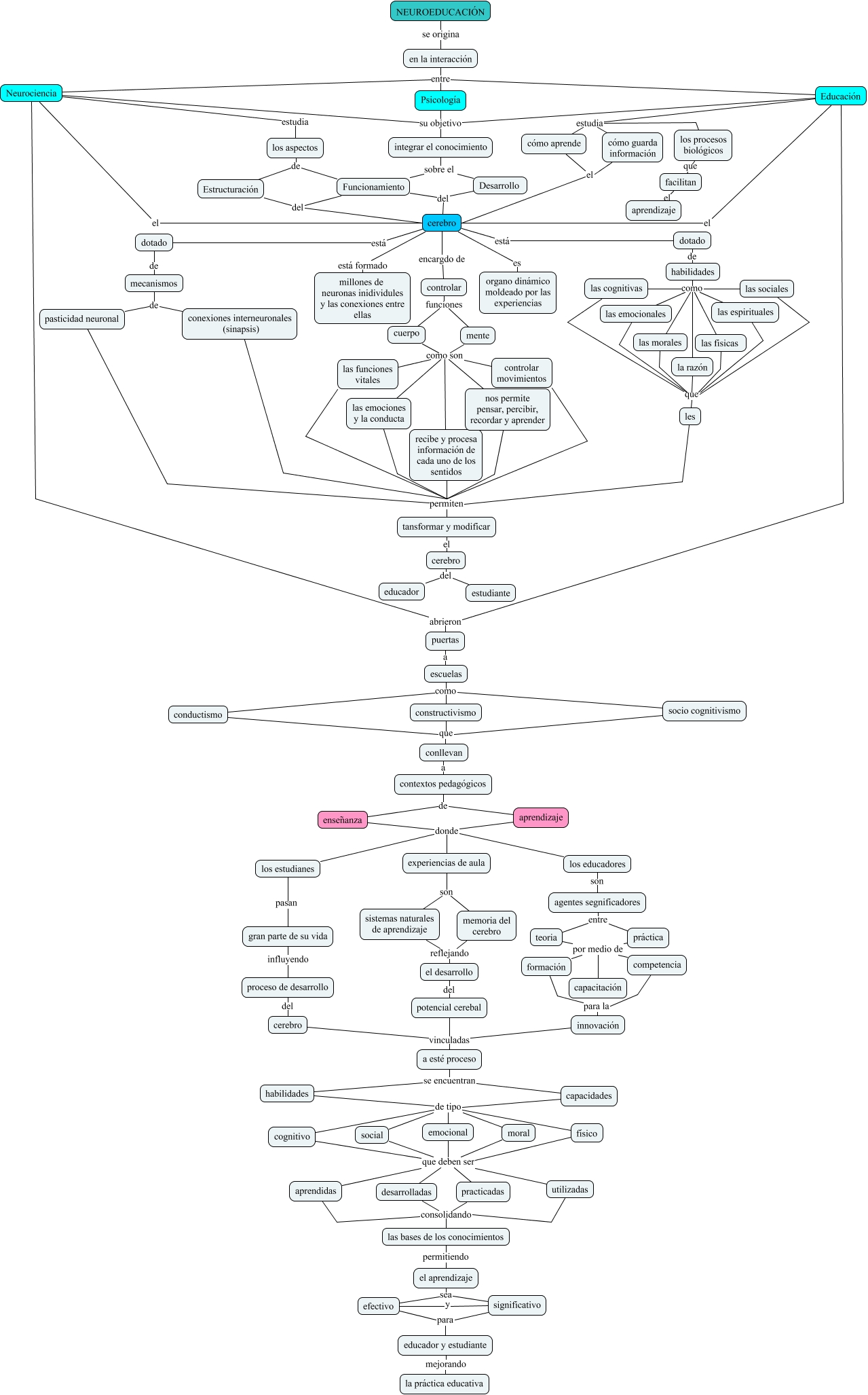 Este Cmap, tiene información relacionada con: neuroeducación, cerebro está formado millones de neuronas inidividules y las conexiones entre ellas, Educación su objetivo integrar el conocimiento, efectivo y significativo, aprendizaje donde experiencias de aula, físico que deben ser practicadas, habilidades de tipo moral, sistemas naturales de aprendizaje reflejando el desarrollo, puertas a escuelas, enseñanza donde los estudianes, Estructuración del cerebro, cerebro vinculadas a esté proceso, las cognitivas que les, social que deben ser desarrolladas, cuerpo como son controlar movimientos, a esté proceso se encuentran habilidades, controlar funciones mente, físico que deben ser utilizadas, experiencias de aula son sistemas naturales de aprendizaje, social que deben ser utilizadas, conllevan a contextos pedagógicos
