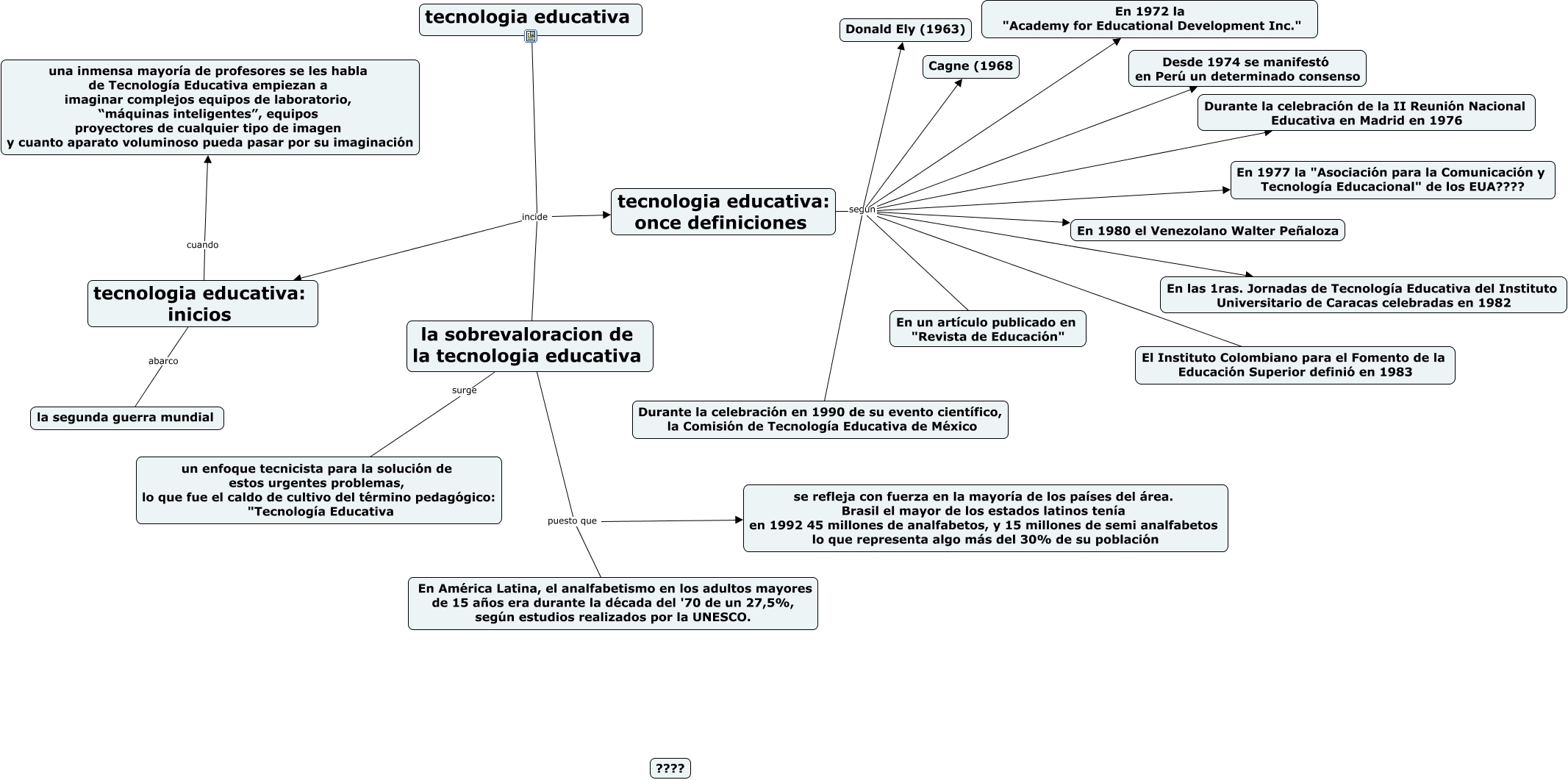 Este Cmap, tiene información relacionada con: tec, tecnologia educativa: once definiciones segun En las 1ras. Jornadas de Tecnología Educativa del Instituto Universitario de Caracas celebradas en 1982, tecnologia educativa: once definiciones segun Donald Ely (1963), tecnologia educativa: once definiciones segun En 1977 la "Asociación para la Comunicación y Tecnología Educacional" de los EUA????, tecnologia educativa: once definiciones segun Cagne (1968, tecnologia educativa: inicios cuando una inmensa mayoría de profesores se les habla de Tecnología Educativa empiezan a imaginar complejos equipos de laboratorio, “máquinas inteligentes”, equipos proyectores de cualquier tipo de imagen y cuanto aparato voluminoso pueda pasar por su imaginación, tecnologia educativa incide tecnologia educativa: inicios, la sobrevaloracion de la tecnologia educativa puesto que En América Latina, el analfabetismo en los adultos mayores de 15 años era durante la década del '70 de un 27,5%, según estudios realizados por la UNESCO., tecnologia educativa: once definiciones segun Desde 1974 se manifestó en Perú un determinado consenso, tecnologia educativa: once definiciones segun Durante la celebración de la II Reunión Nacional Educativa en Madrid en 1976, tecnologia educativa: once definiciones segun Durante la celebración en 1990 de su evento científico, la Comisión de Tecnología Educativa de México, tecnologia educativa: once definiciones segun En un artículo publicado en "Revista de Educación", la sobrevaloracion de la tecnologia educativa surge un enfoque tecnicista para la solución de estos urgentes problemas, lo que fue el caldo de cultivo del término pedagógico: "Tecnología Educativa, tecnologia educativa: inicios abarco la segunda guerra mundial, tecnologia educativa: once definiciones segun El Instituto Colombiano para el Fomento de la Educación Superior definió en 1983, tecnologia educativa: once definiciones segun En 1972 la "Academy for Educational Development Inc.", la sobrevaloracion de la tecnologia educativa puesto que se refleja con fuerza en la mayoría de los países del área. Brasil el mayor de los estados latinos tenía en 1992 45 millones de analfabetos, y 15 millones de semi analfabetos lo que representa algo más del 30% de su población, tecnologia educativa: once definiciones segun En 1980 el Venezolano Walter Peñaloza, tecnologia educativa incide la sobrevaloracion de la tecnologia educativa, tecnologia educativa incide tecnologia educativa: once definiciones