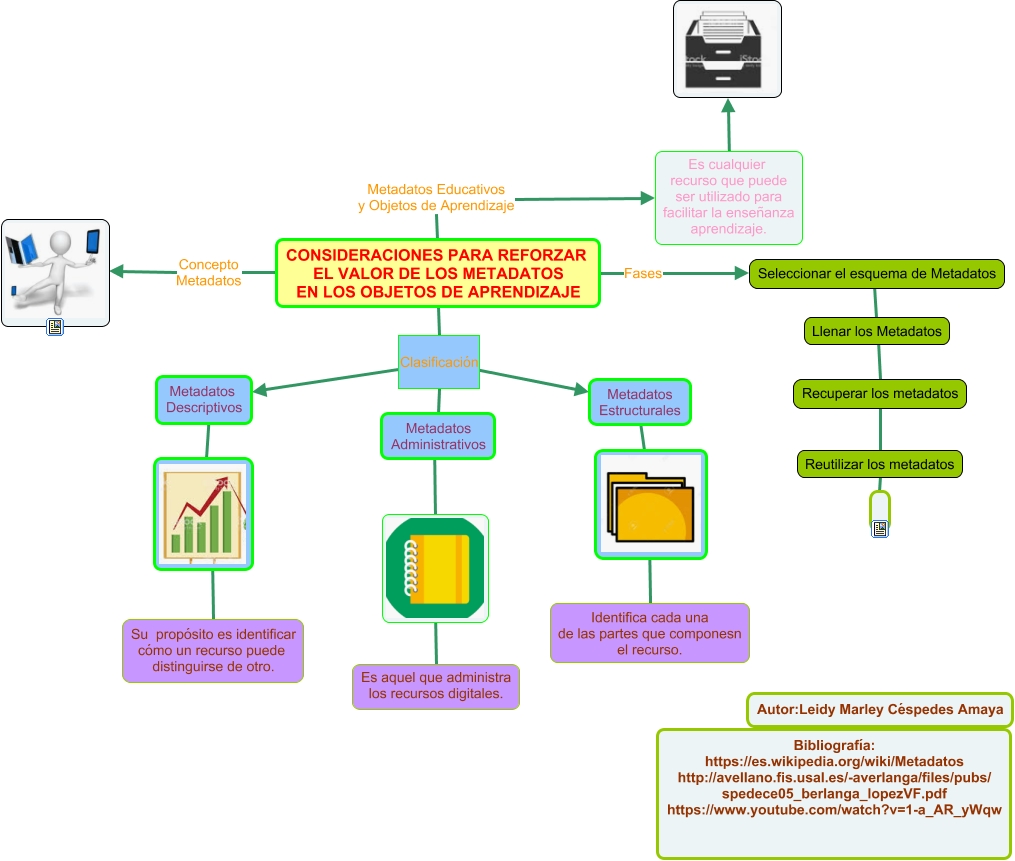 Este Cmap, tiene información relacionada con: metadatos, Metadatos Descriptivos ????, Metadatos Estructurales ????, Metadatos Administrativos ????, CONSIDERACIONES PARA REFORZAR EL VALOR DE LOS METADATOS EN LOS OBJETOS DE APRENDIZAJE Concepto Metadatos, Llenar los Metadatos ???? Recuperar los metadatos, ???? Su propósito es identificar cómo un recurso puede distinguirse de otro., CONSIDERACIONES PARA REFORZAR EL VALOR DE LOS METADATOS EN LOS OBJETOS DE APRENDIZAJE Metadatos Educativos y Objetos de Aprendizaje Es cualquier recurso que puede ser utilizado para facilitar la enseñanza aprendizaje., CONSIDERACIONES PARA REFORZAR EL VALOR DE LOS METADATOS EN LOS OBJETOS DE APRENDIZAJE Fases Seleccionar el esquema de Metadatos, Seleccionar el esquema de Metadatos ???? Llenar los Metadatos, Reutilizar los metadatos ????, ???? Identifica cada una de las partes que componesn el recurso., CONSIDERACIONES PARA REFORZAR EL VALOR DE LOS METADATOS EN LOS OBJETOS DE APRENDIZAJE Clasificación Metadatos Estructurales, Recuperar los metadatos ???? Reutilizar los metadatos, Bibliografía: https://es.wikipedia.org/wiki/Metadatos http://avellano.fis.usal.es/-averlanga/files/pubs/ spedece05_berlanga_lopezVF.pdf https://www.youtube.com/watch?v=1-a_AR_yWqw ???? Autor:Leidy Marley Céspedes Amaya, Es cualquier recurso que puede ser utilizado para facilitar la enseñanza aprendizaje. ????, CONSIDERACIONES PARA REFORZAR EL VALOR DE LOS METADATOS EN LOS OBJETOS DE APRENDIZAJE Clasificación Metadatos Administrativos, Bibliografía: https://es.wikipedia.org/wiki/Metadatos http://avellano.fis.usal.es/-averlanga/files/pubs/ spedece05_berlanga_lopezVF.pdf https://www.youtube.com/watch?v=1-a_AR_yWqw ???? Autor:Leidy Marley Céspedes Amaya, ???? Es aquel que administra los recursos digitales., CONSIDERACIONES PARA REFORZAR EL VALOR DE LOS METADATOS EN LOS OBJETOS DE APRENDIZAJE Clasificación Metadatos Descriptivos