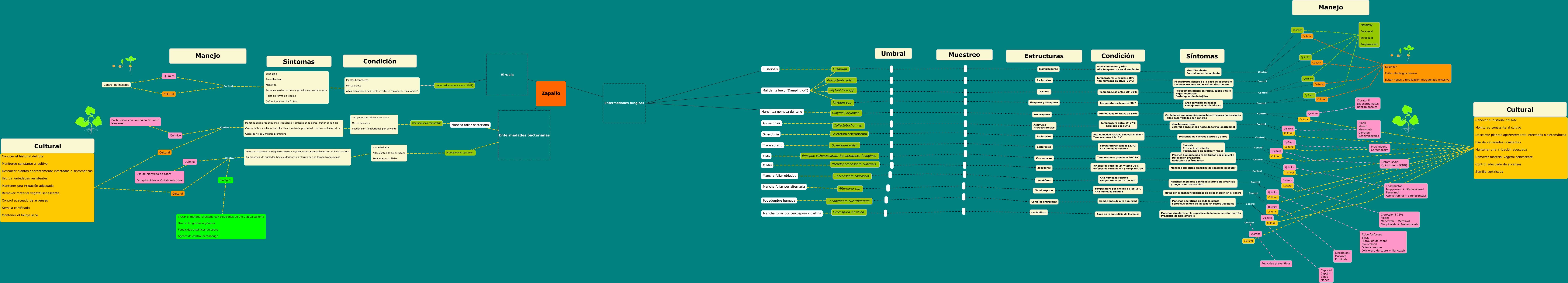 Este Cmap, tiene información relacionada con: mapa insectos zapallo 2, Rhizoctonia solani,, Cultural Conocer el historial del lote Monitoreo constante al cultivo Descartar plantas aparentemente infectadas o sintomáticas Uso de variedades resistentes Mantener una irrigación adecuada Remover material vegetal senescente Control adecuado de arvenses Semilla certificada, Químico ???? Fugicidas preventivos, Conidióforo, Casmotecios, Plantas hospederas Mosca blanca Altas poblaciones de insectos vectores (pulgones, trips, áfidos) Enanismo Amarillamiento Mosaicos Patrones verdes oscuros alternados con verdes claros Hojas en forma de lóbulos Deformidades en los frutos, Collectotrichum sp ???? Antracnosis, Esclerocios ???? Temperaturas elevadas (30°C) Alta humedad relativa (96%), Cultural Solarizar Evitar almácigos densos Evitar riegos y fertilización nitrogenada excesiva, Alternaria spp ???? Mancha foliar por alternaria, Marchitamiento Podredumbre de la planta Control Cultural, Biológico ???? Tratar el material afectado con soluciones de ajo y agua caliente Uso de fungicidas orgánicos Fungicidas orgánicos de cobre Agente de control pentaphage, Manchas circulares en la superficie de la hoja, de color marrón Presencia de halo amarillo Control Cultural,,, Alta humedad relativa (mayor al 80%) Temperaturas 15-18°C Control Cultural, Suelos húmedos y fríos Alta temperatura en el ambiente ???? Marchitamiento Podredumbre de la planta, Cercospora citrullina ???? Mancha foliar por cercospora citrullina, Sclerotium rolfsii