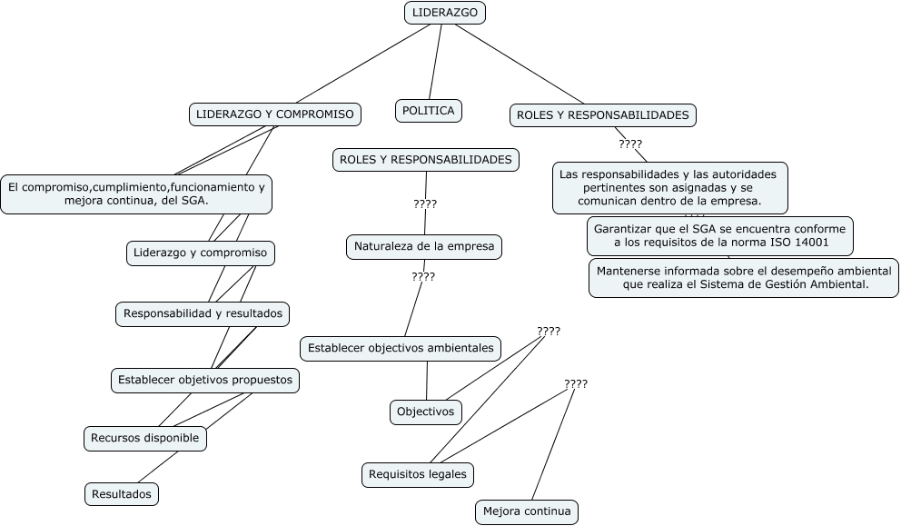 Este Cmap, tiene información relacionada con: borrador, LIDERAZGO ???? LIDERAZGO Y COMPROMISO, Establecer objectivos ambientales ???? Objectivos, ROLES Y RESPONSABILIDADES ???? Naturaleza de la empresa, LIDERAZGO ???? POLITICA, El compromiso,cumplimiento,funcionamiento y mejora continua, del SGA. ???? Liderazgo y compromiso, ROLES Y RESPONSABILIDADES ???? Las responsabilidades y las autoridades pertinentes son asignadas y se comunican dentro de la empresa., Responsabilidad y resultados ???? Establecer objetivos propuestos, LIDERAZGO Y COMPROMISO ???? El compromiso,cumplimiento,funcionamiento y mejora continua, del SGA., LIDERAZGO ???? ROLES Y RESPONSABILIDADES, Las responsabilidades y las autoridades pertinentes son asignadas y se comunican dentro de la empresa. ???? Mantenerse informada sobre el desempeño ambiental que realiza el Sistema de Gestión Ambiental., Requisitos legales ???? Mejora continua, Establecer objetivos propuestos ???? Recursos disponible, Naturaleza de la empresa ???? Establecer objectivos ambientales, Liderazgo y compromiso ???? Responsabilidad y resultados, Objectivos ???? Requisitos legales, Las responsabilidades y las autoridades pertinentes son asignadas y se comunican dentro de la empresa. ???? Garantizar que el SGA se encuentra conforme a los requisitos de la norma ISO 14001, Recursos disponible ???? Resultados