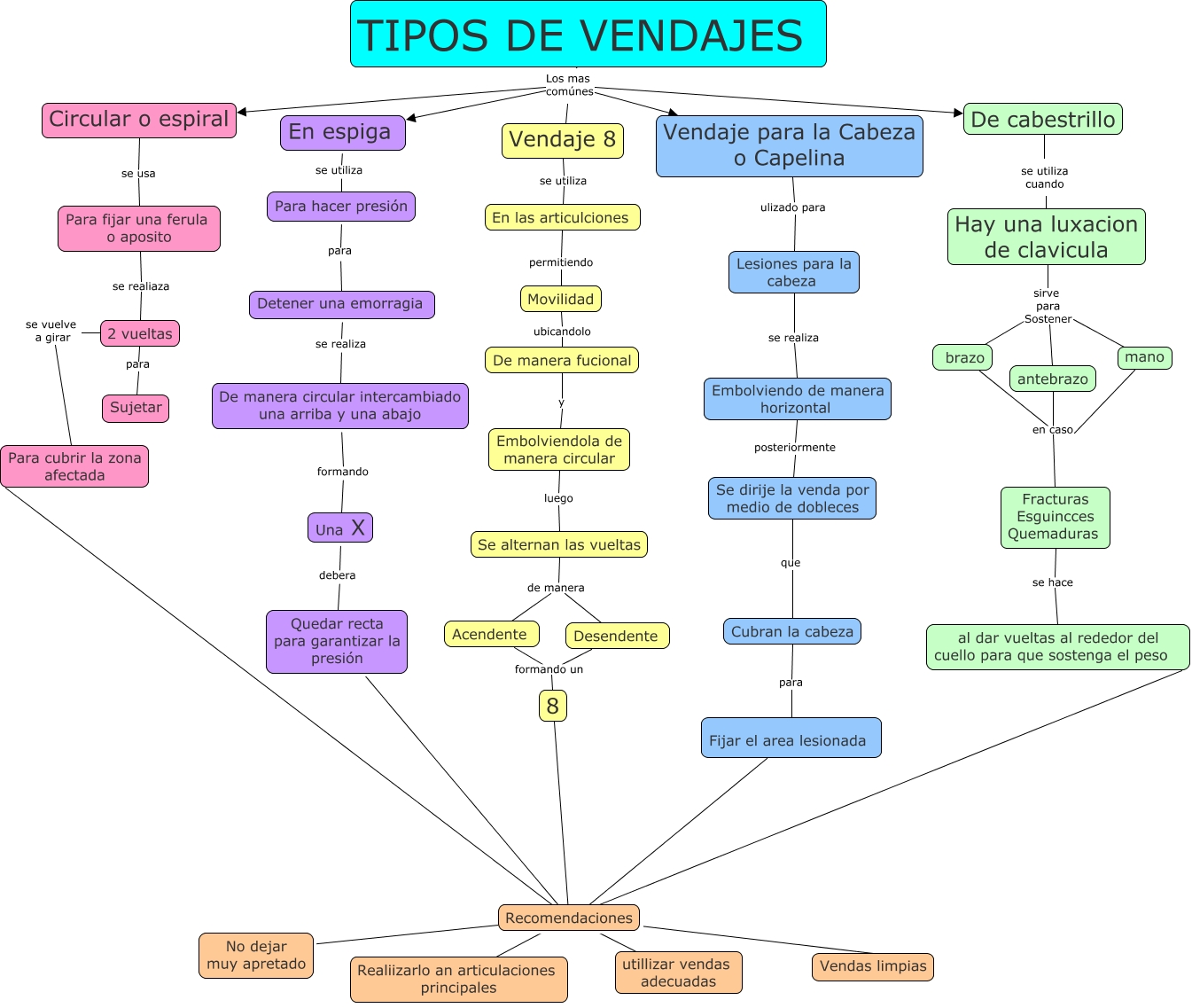 Este Cmap, tiene información relacionada con: Vendajes, Hay una luxacion de clavicula sirve para Sostener antebrazo, De manera fucional y Embolviendola de manera circular, Para cubrir la zona afectada ???? Recomendaciones, TIPOS DE VENDAJES Los mas comúnes Vendaje 8, al dar vueltas al rededor del cuello para que sostenga el peso ???? Recomendaciones, Detener una emorragia se realiza De manera circular intercambiado una arriba y una abajo, TIPOS DE VENDAJES Los mas comúnes En espiga, Fijar el area lesionada ???? Recomendaciones, TIPOS DE VENDAJES Los mas comúnes Circular o espiral, mano en caso Fracturas Esguincces Quemaduras, TIPOS DE VENDAJES Los mas comúnes Vendaje para la Cabeza o Capelina, Una X debera Quedar recta para garantizar la presión, Se alternan las vueltas de manera Acendente, 8 ???? Recomendaciones, Para hacer presión para Detener una emorragia, Vendaje para la Cabeza o Capelina ulizado para Lesiones para la cabeza, Desendente formando un 8, Recomendaciones ???? Realiizarlo an articulaciones principales, Lesiones para la cabeza se realiza Embolviendo de manera horizontal, Se dirije la venda por medio de dobleces que Cubran la cabeza