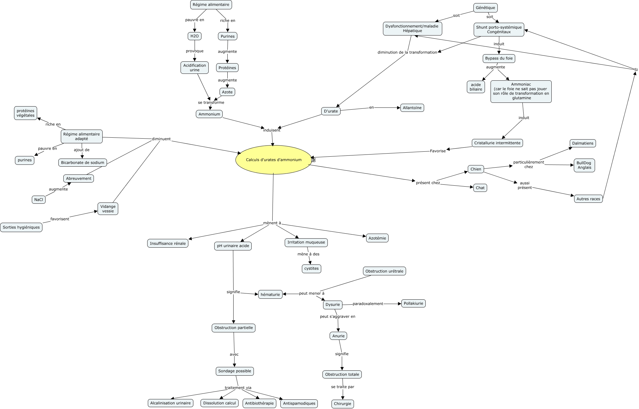 Cette carte de concepts créée avec IHMC CmapTools traite de: Urate d'ammonium, Acidification urine se transforme Ammonium, Abreuvement diminuent Calculs d'urates d'ammonium, Dysurie peut s'aggraver en Anurie, pH urinaire acide signifie hématurie, Sondage possible traitement via Dissolution calcul, Chien particulièrement chez BullDog Anglais, Régime alimentaire adapté ajout de Bicarbonate de sodium, D'urate induisent Calculs d'urates d'ammonium, Chien aussi présent Autres races, Shunt porto-systémique Congénitaux induit Bypass du foie, Calculs d'urates d'ammonium apparence Granulaire, Génétique soit Shunt porto-systémique Congénitaux, Anurie signifie Obstruction totale, Calculs d'urates d'ammonium mènent à Irritation muqueuse, H2O provoque Acidification urine, Régime alimentaire adapté diminuent Calculs d'urates d'ammonium, Irritation muqueuse mène à des cystites, Régime alimentaire adapté riche en protéines végétales, Sondage possible traitement via Alcalinisation urinaire, Calculs d'urates d'ammonium mènent à Azotémie