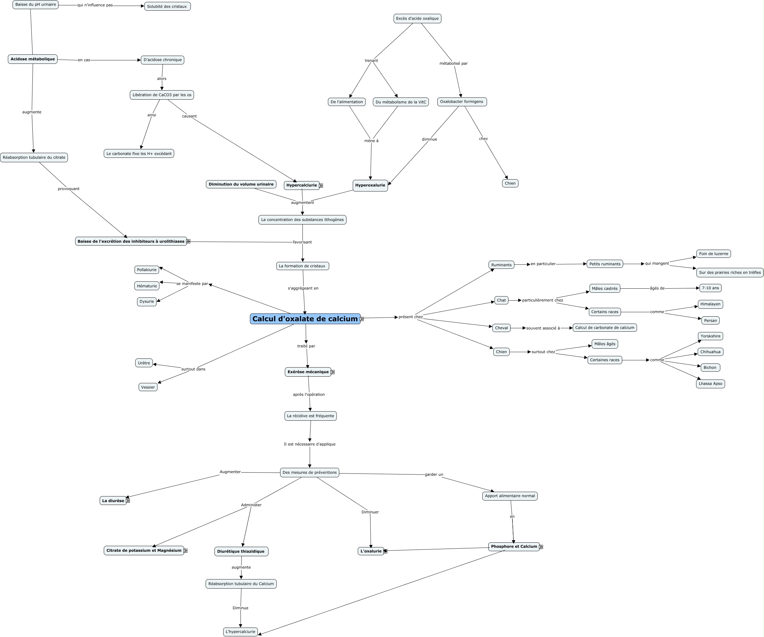 Cette carte de concepts créée avec IHMC CmapTools traite de: Oxalate-de-calcium.cmap, Calcul d'oxalate de calcium surtout dans Vessier, Calcul d'oxalate de calcium présent chez Cheval, Certains races comme Persan, Nourriture à 75% d'humidité par exemple Conserves, Chélateur du Calcium en compétition avec Complexe Oxalate-Calcium, Excès d'acide oxalique Venant Du métabolisme de la VitC, Cristaux de whewellite se reconnaissent par leur Leur radio-opacité, Magnésium qui forme Sel soluble, Chlorure de sodium car L'eau suit le Na+ excrété, Aborption calcium liée à L'hypercalciurie, Réabsorption tubulaire du Calcium Diminue L'hypercalciurie, Complexe Oxalate-Calcium ce qui diminue Aborption calcium, La diurèse Permet Lavage des cristaux néoformés, Calcium car forme Complexe Oxalate-Calcium, Libération de CaCO3 par les os ainsi Le carbonate fixe les H+ excédant, Petits ruminants qui mangent Foin de luzerne, Calcul d'oxalate de calcium présent chez Chat, Calcul d'oxalate de calcium surtout dans Urètre, Magnésium qui favorise Struvite, Sel soluble avec Calcium