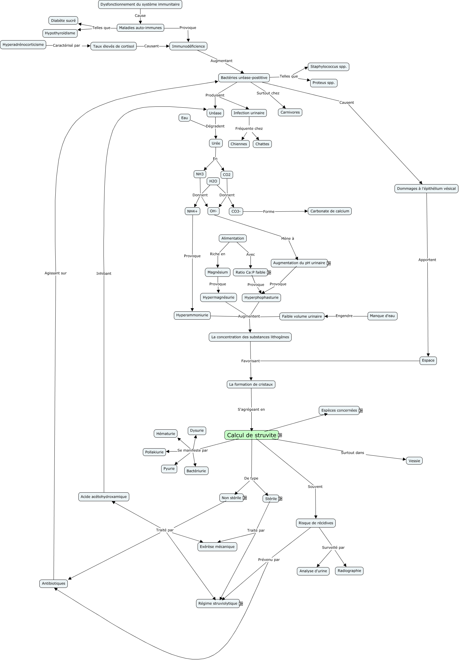 Cette carte de concepts créée avec IHMC CmapTools traite de: Struvite.cmap, Magnésium Provoque Hypermagnésurie, PTH Provoque Ostéolyse, NH3 Donnent OH-, Calcul de struvite Se manifeste par Bactériurie, Régime struviolytique Constitué de Teneur élevée, PO43- Provoque Hyperphophasturie, Calcul de struvite Se manifeste par Pyurie, CO3- Forme Carbonate de calcium, H2O Donnent CO3-, Hyperadrénocorticisme Caractérisé par Taux élevés de cortisol, Infection urinaire Fréquente chez Chattes, Maladies auto-immunes Telles que Diabète sucré, Régime struviolytique Constitué de Acidifiants, Chat Prédisposé Chat européen, Bactéries uréase-postitive Produisent Infection urinaire, Teneur faible En Fibres, Teneur élevée En NaCl, Calcul de struvite Présent chez Cheval, Chat Prédisposé Persan, Hypermagnésurie Augmentent La concentration des substances lithogènes