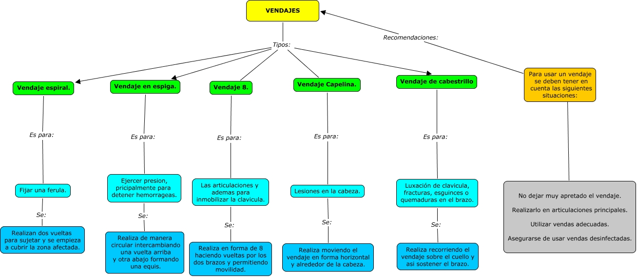 Este Cmap, tiene información relacionada con: Vendajes, Lesiones en la cabeza. Se: Realiza moviendo el vendaje en forma horizontal y alrededor de la cabeza., VENDAJES Tipos: Vendaje Capelina., Las articulaciones y ademas para inmobilizar la clavicula. Se: Realiza en forma de 8 haciendo vueltas por los dos brazos y permitiendo movilidad., Vendaje espiral. Es para: Fijar una ferula., VENDAJES Tipos: Vendaje de cabestrillo, Ejercer presion, pricipalmente para detener hemorrageas. Se: Realiza de manera circular intercambiando una vuelta arriba y otra abajo formando una equis., Vendaje en espiga. Es para: Ejercer presion, pricipalmente para detener hemorrageas., Vendaje Capelina. Es para: Lesiones en la cabeza., Para usar un vendaje se deben tener en cuenta las siguientes situaciones: ???? No dejar muy apretado el vendaje. Realizarlo en articulaciones principales. Utilizar vendas adecuadas. Asegurarse de usar vendas desinfectadas., VENDAJES Tipos: Vendaje espiral., VENDAJES Tipos: Vendaje en espiga., Vendaje 8. Es para: Las articulaciones y ademas para inmobilizar la clavicula., Para usar un vendaje se deben tener en cuenta las siguientes situaciones: Recomendaciones: VENDAJES, Vendaje de cabestrillo Es para: Luxación de clavicula, fracturas, esguinces o quemaduras en el brazo., Fijar una ferula. Se: Realizan dos vueltas para sujetar y se empieza a cubrir la zona afectada., VENDAJES Tipos: Vendaje 8., Luxación de clavicula, fracturas, esguinces o quemaduras en el brazo. Se: Realiza recorriendo el vendaje sobre el cuello y asi sostener el brazo.