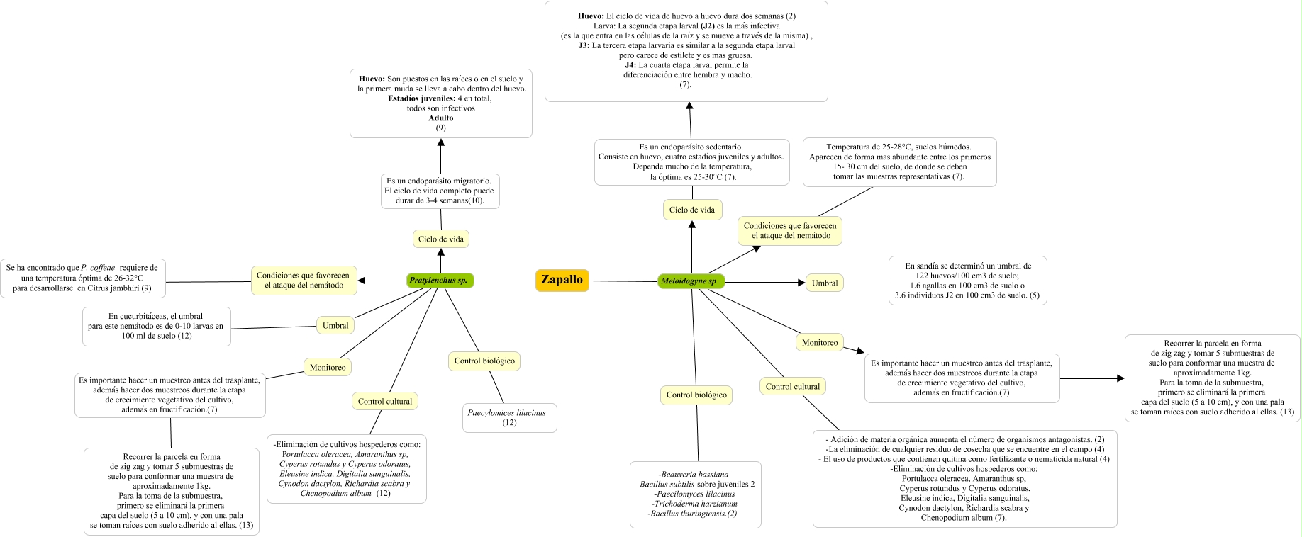 Este Cmap, tiene información relacionada con: mapa nemátodos, Zapallo Meloidogyne sp. Control cultural, Zapallo Meloidogyne sp. Condiciones que favorecen el ataque del nemátodo, Ciclo de vida Es un endoparásito migratorio. El ciclo de vida completo puede durar de 3-4 semanas(10). Huevo: Son puestos en las raíces o en el suelo y la primera muda se lleva a cabo dentro del huevo. Estadíos juveniles: 4 en total, todos son infectivos Adulto (9), Zapallo Meloidogyne sp. Monitoreo, Zapallo Meloidogyne sp. Umbral, Control biológico ???? Paecylomices lilacinus (12), Zapallo Pratylenchus sp. Condiciones que favorecen el ataque del nemátodo, Zapallo Pratylenchus sp. Umbral, Zapallo Pratylenchus sp. Ciclo de vida, Control biológico ???? -Beauveria bassiana -Bacillus subtilissobre juveniles 2 -Paecilomyces lilacinus -Trichoderma harzianum -Bacillus thuringiensis.(2), Control cultural ???? -Eliminación de cultivos hospederos como: Portulacca oleracea, Amaranthus sp, Cyperus rotundus y Cyperus odoratus, Eleusine indica, Digitalia sanguinalis, Cynodon dactylon, Richardia scabra y Chenopodium album (12), Monitoreo ???? Es importante hacer un muestreo antes del trasplante, además hacer dos muestreos durante la etapa de crecimiento vegetativo del cultivo, además en fructificación.(7), Umbral ???? En cucurbitáceas, el umbral para este nemátodo es de 0-10 larvas en 100 ml de suelo (12), Zapallo Pratylenchus sp. Control biológico, Condiciones que favorecen el ataque del nemátodo ???? Temperatura de 25-28°C, suelos húmedos. Aparecen de forma mas abundante entre los primeros 15- 30 cm del suelo, de donde se deben tomar las muestras representativas (7)., Zapallo Pratylenchus sp. Monitoreo, Es importante hacer un muestreo antes del trasplante, además hacer dos muestreos durante la etapa de crecimiento vegetativo del cultivo, además en fructificación.(7) ???? Recorrer la parcela en forma de zig zag y tomar 5 submuestras de suelo para conformar una muestra de aproximadamente 1kg. Para la toma de la submuestra, primero se eliminará la primera capa del suelo (5 a 10 cm), y con una pala se toman raíces con suelo adherido al ellas. (13), Zapallo Meloidogyne sp. Control biológico, Umbral ???? En sandía se determinó un umbral de 122 huevos/100 cm3 de suelo; 1.6 agallas en 100 cm3 de suelo o 3.6 individuos J2 en 100 cm3 de suelo. (5), Ciclo de vida Es un endoparásito sedentario. Consiste en huevo, cuatro estadíos juveniles y adultos. Depende mucho de la temperatura, la óptima es 25-30°C (7). Huevo: El ciclo de vida de huevo a huevo dura dos semanas (2) Larva: La segunda etapa larval (J2) es la más infectiva (es la que entra en las células de la raíz y se mueve a través de la misma) , J3: La tercera etapa larvaria es similar a la segunda etapa larval pero carece de estilete y es mas gruesa. J4: La cuarta etapa larval permite la diferenciación entre hembra y macho. (7).