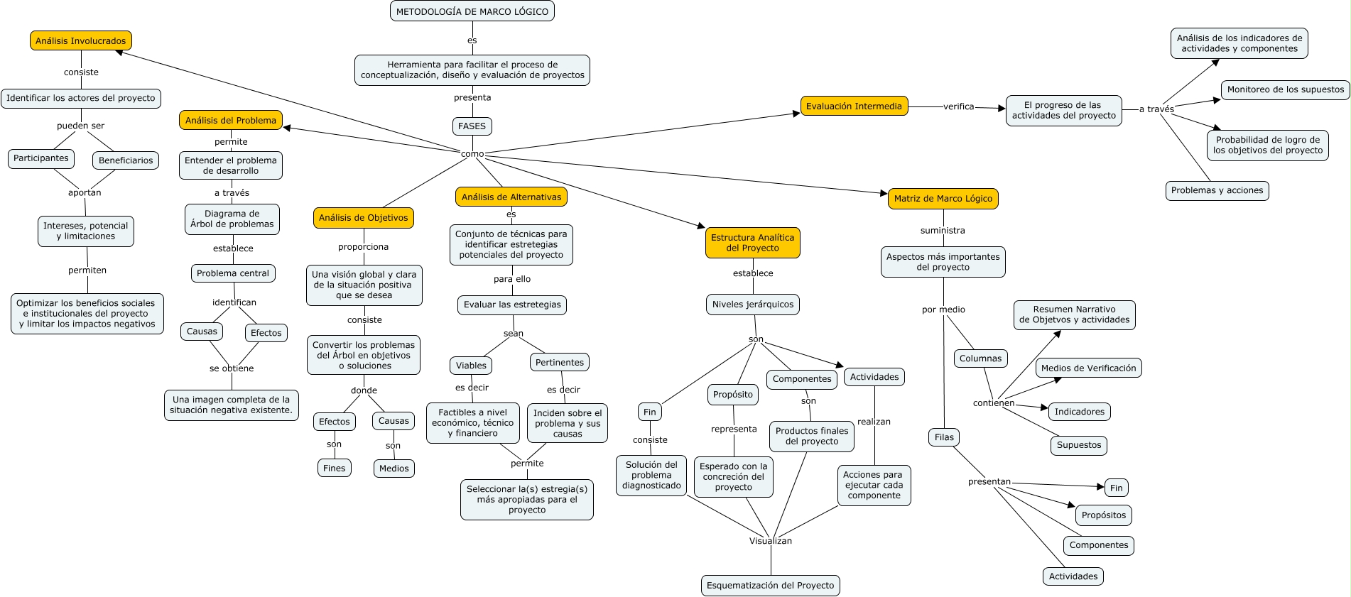 Este Cmap, tiene información relacionada con: Marco Lógico, Columnas contienen Indicadores, Filas presentan Componentes, El progreso de las actividades del proyecto a través Monitoreo de los supuestos, Solución del problema diagnosticado Visualizan Esquematización del Proyecto, Estructura Analítica del Proyecto establece Niveles jerárquicos, Participantes aportan Intereses, potencial y limitaciones, Factibles a nivel económico, técnico y financiero permite Seleccionar la(s) estregia(s) más apropiadas para el proyecto, FASES como Estructura Analítica del Proyecto, Efectos se obtiene Una imagen completa de la situación negativa existente., Intereses, potencial y limitaciones permiten Optimizar los beneficios sociales e institucionales del proyecto y limitar los impactos negativos, Niveles jerárquicos son Componentes, Matriz de Marco Lógico suministra Aspectos más importantes del proyecto, Columnas contienen Medios de Verificación, Evaluación Intermedia verifica El progreso de las actividades del proyecto, Niveles jerárquicos son Propósito, Convertir los problemas del Árbol en objetivos o soluciones donde Causas, Identificar los actores del proyecto pueden ser Participantes, Componentes son Productos finales del proyecto, Acciones para ejecutar cada componente Visualizan Esquematización del Proyecto, Filas presentan Fin