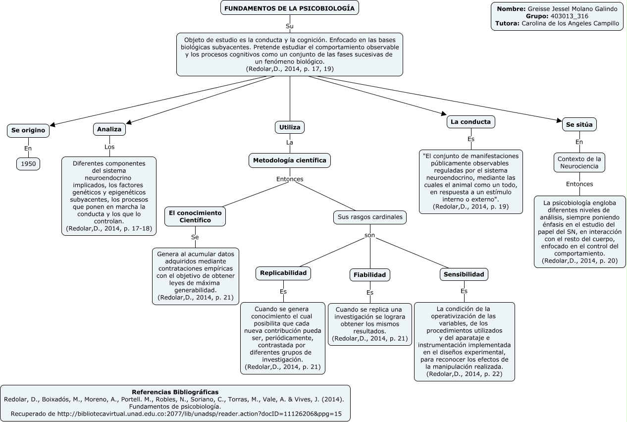 Este Cmap, tiene información relacionada con: Fundamentos de la Psicobiología, Se origino En 1950, Se sitúa En Contexto de la Neurociencia, Sus rasgos cardinales son Sensibilidad, Sensibilidad Es La condición de la operativización de las variables, de los procedimientos utilizados y del aparataje e instrumentación implementada en el diseños experimental, para reconocer los efectos de la manipulación realizada. (Redolar,D., 2014, p. 22), Objeto de estudio es la conducta y la cognición. Enfocado en las bases biológicas subyacentes. Pretende estudiar el comportamiento observable y los procesos cognitivos como un conjunto de las fases sucesivas de un fenómeno biológico. (Redolar,D., 2014, p. 17, 19) ???? Se origino, Objeto de estudio es la conducta y la cognición. Enfocado en las bases biológicas subyacentes. Pretende estudiar el comportamiento observable y los procesos cognitivos como un conjunto de las fases sucesivas de un fenómeno biológico. (Redolar,D., 2014, p. 17, 19) ???? Utiliza, Metodología científica Entonces Sus rasgos cardinales, Sus rasgos cardinales son Replicabilidad, Sus rasgos cardinales son Fiabilidad, Objeto de estudio es la conducta y la cognición. Enfocado en las bases biológicas subyacentes. Pretende estudiar el comportamiento observable y los procesos cognitivos como un conjunto de las fases sucesivas de un fenómeno biológico. (Redolar,D., 2014, p. 17, 19) ???? Analiza, Utiliza La Metodología científica, Analiza Los Diferentes componentes del sistema neuroendocrino implicados, los factores genéticos y epigenéticos subyacentes, los procesos que ponen en marcha la conducta y los que lo controlan. (Redolar,D., 2014, p. 17-18), El conocimiento Científico Se Genera al acumular datos adquiridos mediante contrataciones empíricas con el objetivo de obtener leyes de máxima generabilidad. (Redolar,D., 2014, p. 21), Replicabilidad Es Cuando se genera conocimiento el cual posibilita que cada nueva contribución pueda ser, periódicamente, contrastada por diferentes grupos de investigación. (Redolar,D., 2014, p. 21), Fiabilidad Es Cuando se replica una investigación se lograra obtener los mismos resultados. (Redolar,D., 2014, p. 21), Objeto de estudio es la conducta y la cognición. Enfocado en las bases biológicas subyacentes. Pretende estudiar el comportamiento observable y los procesos cognitivos como un conjunto de las fases sucesivas de un fenómeno biológico. (Redolar,D., 2014, p. 17, 19) ???? Se sitúa, La conducta Es "El conjunto de manifestaciones públicamente observables reguladas por el sistema neuroendocrino, mediante las cuales el animal como un todo, en respuesta a un estímulo interno o externo". (Redolar,D., 2014, p. 19), Contexto de la Neurociencia Entonces La psicobiología engloba diferentes niveles de análisis, siempre poniendo énfasis en el estudio del papel del SN, en interacción con el resto del cuerpo, enfocado en el control del comportamiento. (Redolar,D., 2014, p. 20), FUNDAMENTOS DE LA PSICOBIOLOGÍA Su Objeto de estudio es la conducta y la cognición. Enfocado en las bases biológicas subyacentes. Pretende estudiar el comportamiento observable y los procesos cognitivos como un conjunto de las fases sucesivas de un fenómeno biológico. (Redolar,D., 2014, p. 17, 19), Objeto de estudio es la conducta y la cognición. Enfocado en las bases biológicas subyacentes. Pretende estudiar el comportamiento observable y los procesos cognitivos como un conjunto de las fases sucesivas de un fenómeno biológico. (Redolar,D., 2014, p. 17, 19) ???? La conducta