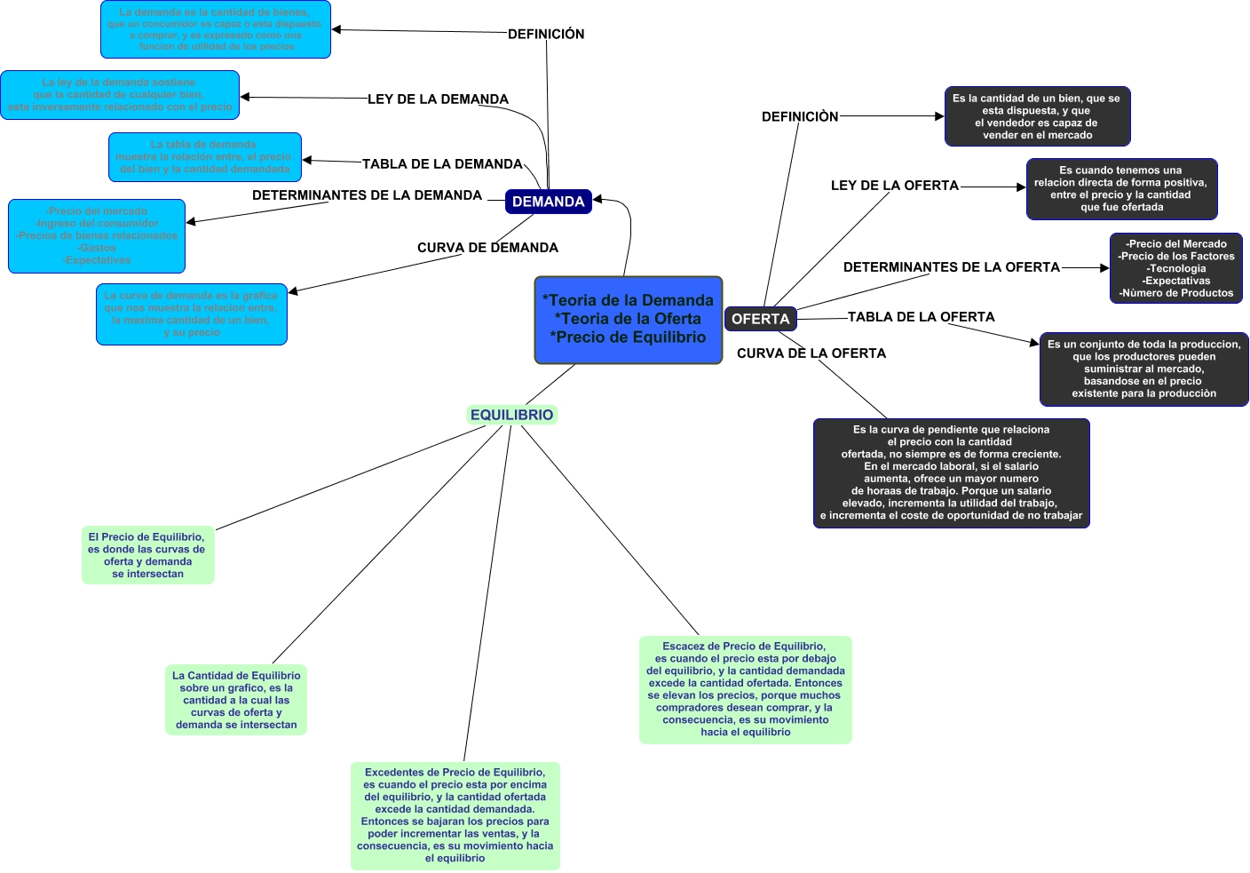 Este Cmap, tiene información relacionada con: Teoria de la Demanda, Oferta y Precio de Equilibrio, *Teoria de la Demanda *Teoria de la Oferta *Precio de Equilibrio EQUILIBRIO El Precio de Equilibrio, es donde las curvas de oferta y demanda se intersectan, OFERTA LEY DE LA OFERTA Es cuando tenemos una relacion directa de forma positiva, entre el precio y la cantidad que fue ofertada, OFERTA DEFINICIÒN Es la cantidad de un bien, que se esta dispuesta, y que el vendedor es capaz de vender en el mercado, DEMANDA TABLA DE LA DEMANDA La tabla de demanda muestra la relación entre, el precio del bien y la cantidad demandada, *Teoria de la Demanda *Teoria de la Oferta *Precio de Equilibrio EQUILIBRIO Escacez de Precio de Equilibrio, es cuando el precio esta por debajo del equilibrio, y la cantidad demandada excede la cantidad ofertada. Entonces se elevan los precios, porque muchos compradores desean comprar, y la consecuencia, es su movimiento hacia el equilibrio, *Teoria de la Demanda *Teoria de la Oferta *Precio de Equilibrio EQUILIBRIO Excedentes de Precio de Equilibrio, es cuando el precio esta por encima del equilibrio, y la cantidad ofertada excede la cantidad demandada. Entonces se bajaran los precios para poder incrementar las ventas, y la consecuencia, es su movimiento hacia el equilibrio, *Teoria de la Demanda *Teoria de la Oferta *Precio de Equilibrio ???? DEMANDA, DEMANDA CURVA DE DEMANDA La curva de demanda es la grafica que nos muestra la relacion entre, la maxima cantidad de un bien, y su precio, *Teoria de la Demanda *Teoria de la Oferta *Precio de Equilibrio EQUILIBRIO La Cantidad de Equilibrio sobre un grafico, es la cantidad a la cual las curvas de oferta y demanda se intersectan, OFERTA CURVA DE LA OFERTA Es la curva de pendiente que relaciona el precio con la cantidad ofertada, no siempre es de forma creciente. En el mercado laboral, si el salario aumenta, ofrece un mayor numero de horaas de trabajo. Porque un salario elevado, incrementa la utilidad del trabajo, e incrementa el coste de oportunidad de no trabajar, OFERTA TABLA DE LA OFERTA Es un conjunto de toda la produccion, que los productores pueden suministrar al mercado, basandose en el precio existente para la producciòn, OFERTA DETERMINANTES DE LA OFERTA -Precio del Mercado -Precio de los Factores -Tecnologia -Expectativas -Nùmero de Productos, DEMANDA LEY DE LA DEMANDA La ley de la demanda sostiene que la cantidad de cualquier bien, esta inversamente relacionado con el precio, DEMANDA DETERMINANTES DE LA DEMANDA -Precio del mercado -Ingreso del consumidor -Precios de bienes relacionados -Gastos -Expectativas, DEMANDA DEFINICIÓN La demanda es la cantidad de bienes, que un concumidor es capaz o esta dispuesto a comprar, y es expresado como una funcion de utilidad de los precios