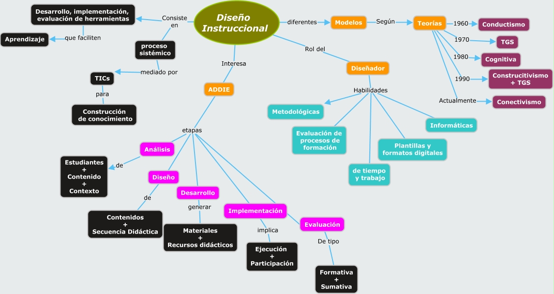 Este Cmap, tiene información relacionada con: ADDIE.cmap, ADDIE etapas Diseño, Diseño Instruccional Interesa ADDIE, Evaluación etapas Desarrollo, TICs para Construcción de conocimiento, Evaluación De tipo Formativa + Sumativa, Diseñador Habilidades de tiempo y trabajo, Evaluación etapas Implementación, Evaluación etapas Análisis, proceso sistémico mediado por TICs, Diseñador Habilidades Evaluación de procesos de formación, Implementación implica Ejecución + Participación, Análisis de Estudiantes + Contenido + Contexto, ADDIE etapas Desarrollo, Desarrollo generar Materiales + Recursos didácticos, Diseño Instruccional Consiste en Desarrollo, implementación, evaluación de herramientas, ADDIE etapas Análisis, Desarrollo, implementación, evaluación de herramientas que faciliten Aprendizaje, Diseñador Habilidades Metodológicas, Diseño de Contenidos + Secuencia Didáctica, Teorías 1970 TGS