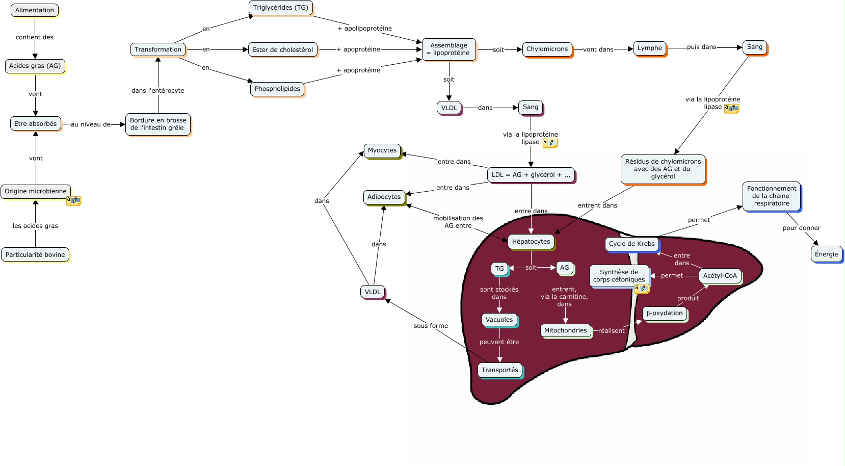 Cette carte de concepts créée avec IHMC CmapTools traite de: Métabolisme des lipides, Ester de cholestérol + apoprotéine Assemblage = lipoprotéine, Assemblage = lipoprotéine soit VLDL, Origine microbienne vont Etre absorbés, VLDL dans Adipocytes, Sang via la lipoprotéine lipase LDL = AG + glycérol + ..., Assemblage = lipoprotéine soit Chylomicrons, AG entrent, via la carnitine, dans Mitochondries, Particularité bovine les acides gras Origine microbienne, Hépatocytes soit AG, Vacuoles peuvent être Transportés, VLDL dans Myocytes, Acétyl-CoA permet Synthèse de corps cétoniques, Lymphe puis dans Sang, LDL = AG + glycérol + ... entre dans Hépatocytes, VLDL dans Sang, Transformation en Ester de cholestérol, Fonctionnement de la chaine respiratoire pour donner Énergie, Transportés sous forme VLDL, Transformation en Phospholipides, β-oxydation produit Acétyl-CoA