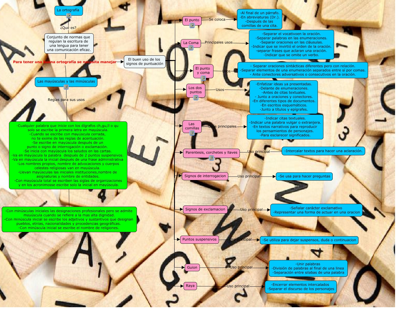 Este Cmap, tiene información relacionada con: Español, La ortografía ¿Qué es? Conjunto de normas que regulan la escritura de una lengua para tener una comunicación eficaz., El buen uso de los signos de puntuación Raya, Las comillas Usos principales -Indicar citas textuales. -Indicar una palabra vulgar o extranjera. -En textos narrativos para reproducir los pensamientos de personajes. -Para esclarecer significados., El buen uso de los signos de puntuación Guion, Signos de exclamacion Uso principal -Señalar carácter exclamativo -Representar una forma de actuar en una oracion, El buen uso de los signos de puntuación ???? La Coma, El buen uso de los signos de puntuación Signos de interrogacion, Raya Uso principal -Encerrar elementos intercalados -Separar el discurso de los personajes, Guion Uso principal -Unir palabras -División de palabras al final de una linea -Separación entre silabas de una palabra, El buen uso de los signos de puntuación ???? El punto, El buen uso de los signos de puntuación ???? Parentesis, corchetes y llaves, El buen uso de los signos de puntuación Puntos suspensivos, Las mayúsculas y las minúsculas Para tener una buena ortografía se necesita manejar El buen uso de los signos de puntuación, -Con minúsculas iniciales las designaciones profesionales pero se admite mayúscula cuando se refiere a la mas alta dignidad. -Con minúscula inicial se escribe los adjetivos y sustantivos que designan pueblos, etnias, nacionalidades y procedencias geográficas. -Con minúscula inicial se escribe el nombre de religiones. ???? -Cualquier palabra que inicie con los dígrafos ch,gu,ll o qu solo se escribe la primera letra en mayúscula. -Cuando se escribe con mayúscula cerrada, no te exime de las reglas de acentuación. -Se escribe en mayúscula después de un punto o signo de interrogación o exclamación. -Se inicia con mayúscula los saludos en las cartas. -Va en mayúscula la palabra después de 2 puntos suspensivos. -Va en mayúscula la inicial después de una frase administrativa -Los nombres propios, nombre de advocaciones y cuerpos celestes religiosas van en mayúscula. -Llevan mayúsculas las iniciales instituciones,nombre de asignaturas y nombre de entidades. -Con mayúscula total se escriben las siglas de organizaciones y en los acronimosse escribe solo la inicial en mayúscula., Las mayúsculas y las minúsculas Reglas para sus usos -Cualquier palabra que inicie con los dígrafos ch,gu,ll o qu solo se escribe la primera letra en mayúscula. -Cuando se escribe con mayúscula cerrada, no te exime de las reglas de acentuación. -Se escribe en mayúscula después de un punto o signo de interrogación o exclamación. -Se inicia con mayúscula los saludos en las cartas. -Va en mayúscula la palabra después de 2 puntos suspensivos. -Va en mayúscula la inicial después de una frase administrativa -Los nombres propios, nombre de advocaciones y cuerpos celestes religiosas van en mayúscula. -Llevan mayúsculas las iniciales instituciones,nombre de asignaturas y nombre de entidades. -Con mayúscula total se escriben las siglas de organizaciones y en los acronimosse escribe solo la inicial en mayúscula., Signos de interrogacion Uso principal -Se usa para hacer preguntas, La Coma Principales usos -Separar el vocativoen la oración. -Separar palabras en las enumeraciones. -Separar oraciones en las cláusulas. -Indicar que se invirtió el orden de la oración. -separar frases que aclaran una oración. -Indicar que se omite un verbo., Las mayúsculas y las minúsculas Para tener una buena ortografía se necesita manejar Conjunto de normas que regulan la escritura de una lengua para tener una comunicación eficaz., Puntos suspensivos Uso principal -Se utiliza para dejar suspensos, duda o continuacion, El buen uso de los signos de puntuación ???? Las comillas