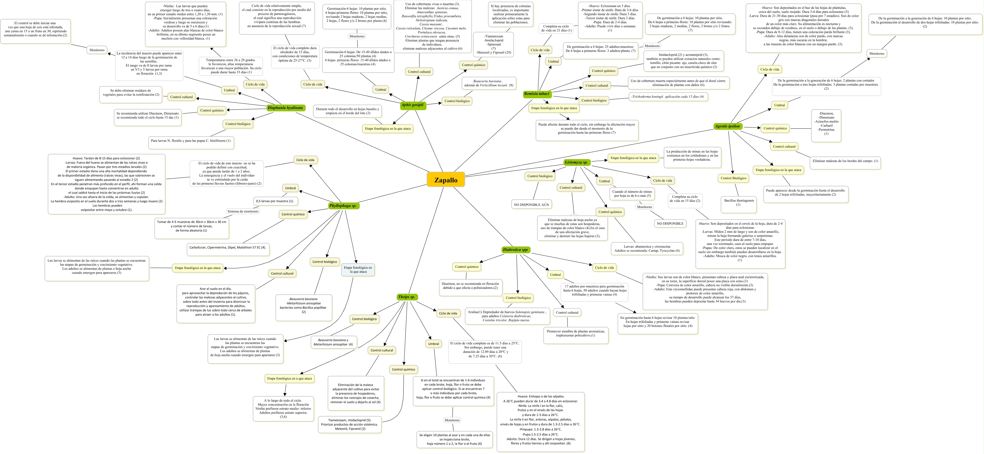 Este Cmap, tiene información relacionada con: mapa insectos 5, Ciclo de vida Completa su ciclo de vida en 15 días (2) -Huevo: Son depositados en el envés de la hoja, dura de 2-4 días para eclosionar. -Larvas: Miden 2 mm de largo y son de color amarillo, minan la hoja formando galerías o serpentinas. Este periodo dura de entre 7-10 días, una vez terminado, caen al suelo para empupar. -Pupas: De color claro, estas se pueden localizar en el suelo sin embargo también pueden desarrollarse en la hoja. -Adulto: Mosca de color negro, con tonos amarillos. (1), Umbral Pepino Cuando el número de minas por hoja es de 6 o más (5), Zapallo Aphis gosipii Control biológico, Control cultural ???? Eliminar malezas de hoja ancha ya que se muchas de estas son hospederas, uso de trampas de color blanco (4).En el caso de una afectación grave, eliminar y destruir las hojas bajeras (3)., Zapallo Bemisia tabaci Etapa fenológica en la que ataca, Control químico ???? Imidacloprid (2) y acetamiprid (3), también se pueden utilizar extractos naturales como: tomillo, chile picante- ajo, canela-clavo de olor que en conjunto con un insecticida químico (2), Zapallo Liriomyza sp. Control químico, Zapallo Thrips sp. Ciclo de vida, Zapallo Liriomyza sp. Umbral, Cuando el número de minas por hoja es de 6 o más (5) Monitoreo NO DISPONIBLE, Zapallo Diabrotica spp Ciclo de vida, Zapallo Phyllophaga sp. Control químico, Zapallo Agrotis ipsilon Control químico, Zapallo Thrips sp. Umbral, Etapa fenológica en la que ataca ???? Puede aparecer desde la germinación hasta el desarrollo de 2 hojas trifoliadas, mayoritariamente (2), Zapallo Agrotis ipsilon Control cultural, Zapallo Agrotis ipsilon Umbral, Control biológico ???? -Beauveria bassiana -Metarhizium anisopliae bacterias como Bacillus popilliae (2), Control cultural ???? Promover siembra de plantas aromaticas, implementar policultivo.(1), Zapallo Liriomyza sp. Etapa fenològica en la que ataca