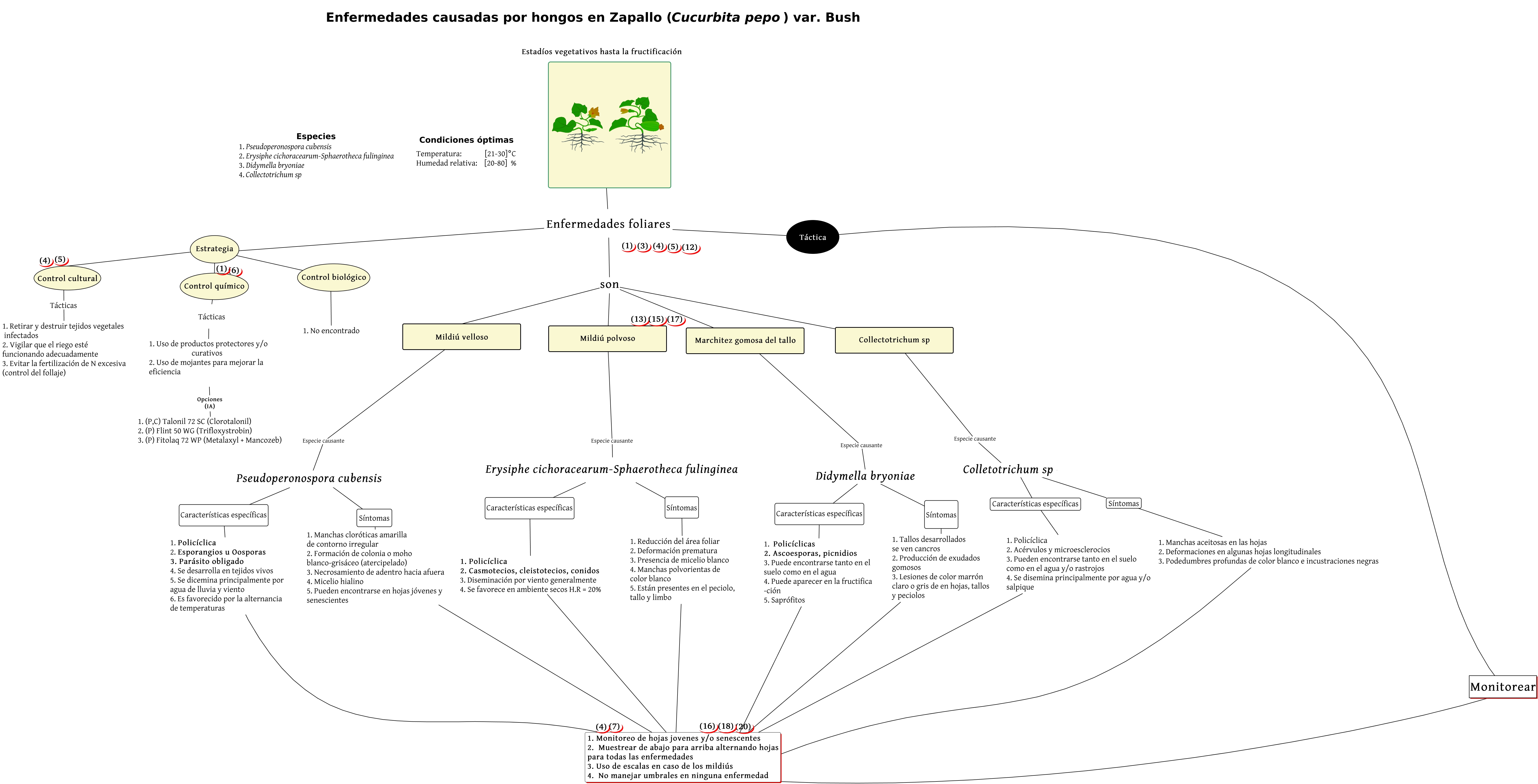 This Concept Map, created with IHMC CmapTools, has information related to: Enfermedades Vf parte 4, Pseudoperonospora cubensis ???? Síntomas, Estrategia ???? Control químico, Didymella bryoniae Características específicas 1. Policíclicas 2. Ascoesporas, picnidios 3. Puede encontrarse tanto en el suelo como en el agua 4. Puede aparecer en la fructifica -ción 5. Saprófitos, 1. Policíclica 2. Esporangios u Oosporas 3. Parásito obligado 4. Se desarrolla en tejidos vivos 5. Se dicemina principalmente por agua de lluvia y viento 6. Es favorecido por la alternancia de temperaturas ???? 1. Monitoreo de hojas jovenes y/o senescentes 2. Muestrear de abajo para arriba alternando hojas para todas las enfermedades 3. Uso de escalas en caso de los mildiús 4. No manejar umbrales en ninguna enfermedad, 1. Uso de productos protectores y/o curativos 2. Uso de mojantes para mejorar la eficiencia Opciones (IA) 1. (P,C) Talonil 72 SC (Clorotalonil) 2. (P) Flint 50 WG (Trifloxystrobin) 3. (P) Fitolaq 72 WP (Metalaxyl + Mancozeb), 1. Policíclicas 2. Ascoesporas, picnidios 3. Puede encontrarse tanto en el suelo como en el agua 4. Puede aparecer en la fructifica -ción 5. Saprófitos ???? 1. Monitoreo de hojas jovenes y/o senescentes 2. Muestrear de abajo para arriba alternando hojas para todas las enfermedades 3. Uso de escalas en caso de los mildiús 4. No manejar umbrales en ninguna enfermedad, 1. Manchas cloróticas amarilla de contorno irregular 2. Formación de colonia o moho blanco-grisáceo (atercipelado) 3. Necrosamiento de adentro hacia afuera 4. Micelio hialino 5. Pueden encontrarse en hojas jóvenes y senescientes ???? 1. Monitoreo de hojas jovenes y/o senescentes 2. Muestrear de abajo para arriba alternando hojas para todas las enfermedades 3. Uso de escalas en caso de los mildiús 4. No manejar umbrales en ninguna enfermedad, Colletotrichum sp ???? Características específicas, Táctica Monitorear 1. Monitoreo de hojas jovenes y/o senescentes 2. Muestrear de abajo para arriba alternando hojas para todas las enfermedades 3. Uso de escalas en caso de los mildiús 4. No manejar umbrales en ninguna enfermedad, Mildiú polvoso Especie causante Erysiphe cichoracearum-Sphaerotheca fulinginea, Control biológico ???? 1. No encontrado, Síntomas ???? Colletotrichum sp, Mildiú velloso Especie causante Pseudoperonospora cubensis, Enfermedades foliares ???? Estrategia, 1. Policíclica 2. Casmotecios, cleistotecios, conidos 3. Diseminación por viento generalmente 4. Se favorece en ambiente secos H.R = 20% ???? 1. Monitoreo de hojas jovenes y/o senescentes 2. Muestrear de abajo para arriba alternando hojas para todas las enfermedades 3. Uso de escalas en caso de los mildiús 4. No manejar umbrales en ninguna enfermedad, Síntomas ???? 1. Manchas cloróticas amarilla de contorno irregular 2. Formación de colonia o moho blanco-grisáceo (atercipelado) 3. Necrosamiento de adentro hacia afuera 4. Micelio hialino 5. Pueden encontrarse en hojas jóvenes y senescientes, Enfermedades foliares son Mildiú polvoso, 1. Reducción del área foliar 2. Deformación prematura 3. Presencia de micelio blanco 4. Manchas polvorientas de color blanco 5. Están presentes en el peciolo, tallo y limbo ???? 1. Monitoreo de hojas jovenes y/o senescentes 2. Muestrear de abajo para arriba alternando hojas para todas las enfermedades 3. Uso de escalas en caso de los mildiús 4. No manejar umbrales en ninguna enfermedad, Control químico ???? Tácticas, Didymella bryoniae Síntomas 1. Tallos desarrollados se ven cancros 2. Producción de exudados gomosos 3. Lesiones de color marrón claro o gris de en hojas, tallos y peciolos