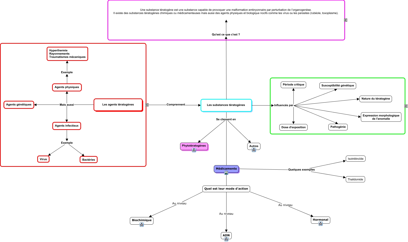 Cette carte de concepts créée avec IHMC CmapTools traite de: Sans titre 2, Les substances tératogènes Qu'est ce que c'est ? Une substance tératogène est une substance capable de provoquer une malformation embryonnaire par perturbation de l’organogenèse. Il existe des substances tératogènes chimiques ou médicamenteuses mais aussi des agents physiques et biologique nocifs comme les virus ou les parasites (rubéole, toxoplasme)., Agents infectieux Exemple Bactéries, Les substances tératogènes Se classent en Médicaments, Les substances tératogènes Influencés par Pathogénie, Agents infectieux Exemple Virus, Les agents tératogènes Comprennent Les substances tératogènes, Les substances tératogènes Se classent en Phytotératogènes, Les agents tératogènes Mais aussi Agents génétiques, Les agents tératogènes Mais aussi Agents infectieux, Les substances tératogènes Influencés par Dose d'exposition, Les substances tératogènes Influencés par Période critique, Quel est leur mode d'action Au niveau Hormonal, Les substances tératogènes Influencés par Susceptibilité génétique, Médicaments Quel est leur mode d'action, Quel est leur mode d'action Au niveau ADN, Les agents tératogènes Mais aussi Agents physiques, Médicaments Quelques exemples Isotrétinoïde, Les substances tératogènes Influencés par Expression morphologique de l'anomalie, Quel est leur mode d'action Au niveau Biochimique, Médicaments Quelques exemples Thalidomide