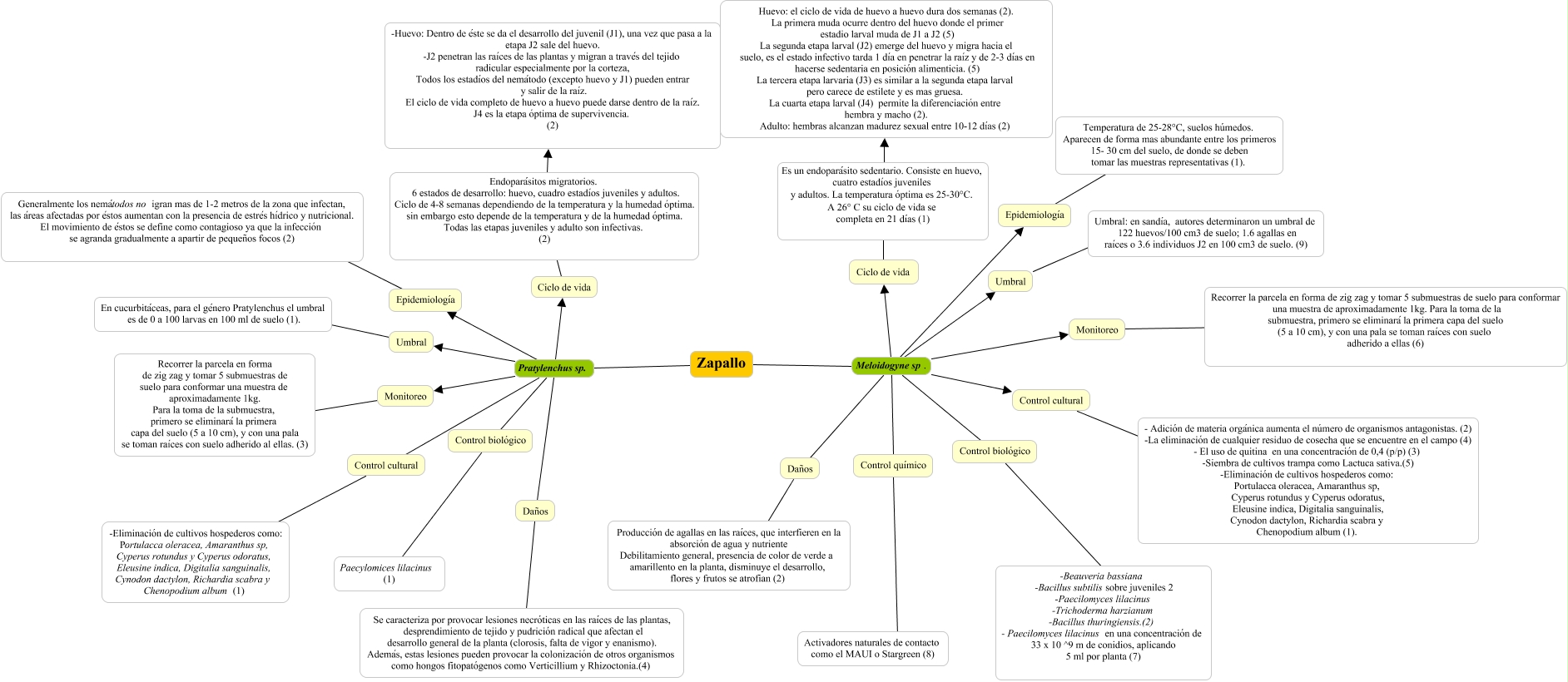 Este Cmap, tiene información relacionada con: mapa nemátodos 3, Monitoreo Recorrer la parcela en forma de zig zag y tomar 5 submuestras de suelo para conformar una muestra de aproximadamente 1kg. Para la toma de la submuestra, primero se eliminará la primera capa del suelo (5 a 10 cm), y con una pala se toman raíces con suelo adherido al ellas. (3), Control biológico ???? Paecylomices lilacinus (1), Control cultural ???? -Eliminación de cultivos hospederos como: Portulacca oleracea, Amaranthus sp, Cyperus rotundus y Cyperus odoratus, Eleusine indica, Digitalia sanguinalis, Cynodon dactylon, Richardia scabra y Chenopodium album (1), Zapallo Meloidogyne sp. Ciclo de vida, Epidemiología ???? Generalmente los nemátodos no igran mas de 1-2 metros de la zona que infectan, las áreas afectadas por éstos aumentan con la presencia de estrés hídrico y nutricional. El movimiento de éstos se define como contagioso ya que la infección se agranda gradualmente a apartir de pequeños focos (2), Daños ???? Producción de agallas en las raíces, que interfieren en la absorción de agua y nutriente Debilitamiento general, presencia de color de verde a amarillento en la planta, disminuye el desarrollo, flores y frutos se atrofian (2), Control biológico ???? -Beauveria bassiana -Bacillus subtilissobre juveniles 2 -Paecilomyces lilacinus -Trichoderma harzianum -Bacillus thuringiensis.(2) - Paecilomyces lilacinus en una concentración de 33 x 10 ^9 m de conidios, aplicando 5 ml por planta (7), Zapallo Meloidogyne sp. Monitoreo, Zapallo Pratylenchus sp. Monitoreo, Ciclo de vida Es un endoparásito sedentario. Consiste en huevo, cuatro estadíos juveniles y adultos. La temperatura óptima es 25-30°C. A 26° C su ciclo de vida se completa en 21 días (1) Huevo: el ciclo de vida de huevo a huevo dura dos semanas (2). La primera muda ocurre dentro del huevo donde el primer estadio larval muda de J1 a J2 (5) La segunda etapa larval (J2) emerge del huevo y migra hacia el suelo, es el estado infectivo tarda 1 día en penetrar la raíz y de 2-3 días en hacerse sedentaria en posición alimenticia. (5) La tercera etapa larvaria (J3) es similar a la segunda etapa larval pero carece de estilete y es mas gruesa. La cuarta etapa larval (J4) permite la diferenciación entre hembra y macho (2). Adulto: hembras alcanzan madurez sexual entre 10-12 días (2), Monitoreo ???? Recorrer la parcela en forma de zig zag y tomar 5 submuestras de suelo para conformar una muestra de aproximadamente 1kg. Para la toma de la submuestra, primero se eliminará la primera capa del suelo (5 a 10 cm), y con una pala se toman raíces con suelo adherido a ellas (6), Zapallo Meloidogyne sp. Umbral, Zapallo Pratylenchus sp. Umbral, Control químico ???? Activadores naturales de contacto como el MAUI o Stargreen (8), Umbral ???? En cucurbitáceas, para el género Pratylenchus el umbral es de 0 a 100 larvas en 100 ml de suelo (1)., Zapallo Meloidogyne sp. Epidemiología, Zapallo Pratylenchus sp. Control cultural, Daños ???? Se caracteriza por provocar lesiones necróticas en las raíces de las plantas, desprendimiento de tejido y pudrición radical que afectan el desarrollo general de la planta (clorosis, falta de vigor y enanismo). Además, estas lesiones pueden provocar la colonización de otros organismos como hongos fitopatógenos como Verticillium y Rhizoctonia.(4), Umbral ???? Umbral: en sandía, autores determinaron un umbral de 122 huevos/100 cm3 de suelo; 1.6 agallas en raíces o 3.6 individuos J2 en 100 cm3 de suelo. (9), Zapallo Pratylenchus sp. Control biológico