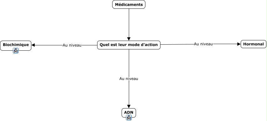 Cette carte de concepts créée avec IHMC CmapTools traite de: Médicaments, Quel est leur mode d'action Au niveau ADN, Quel est leur mode d'action Au niveau Hormonal, Quel est leur mode d'action Au niveau Biochimique, Médicaments Quel est leur mode d'action