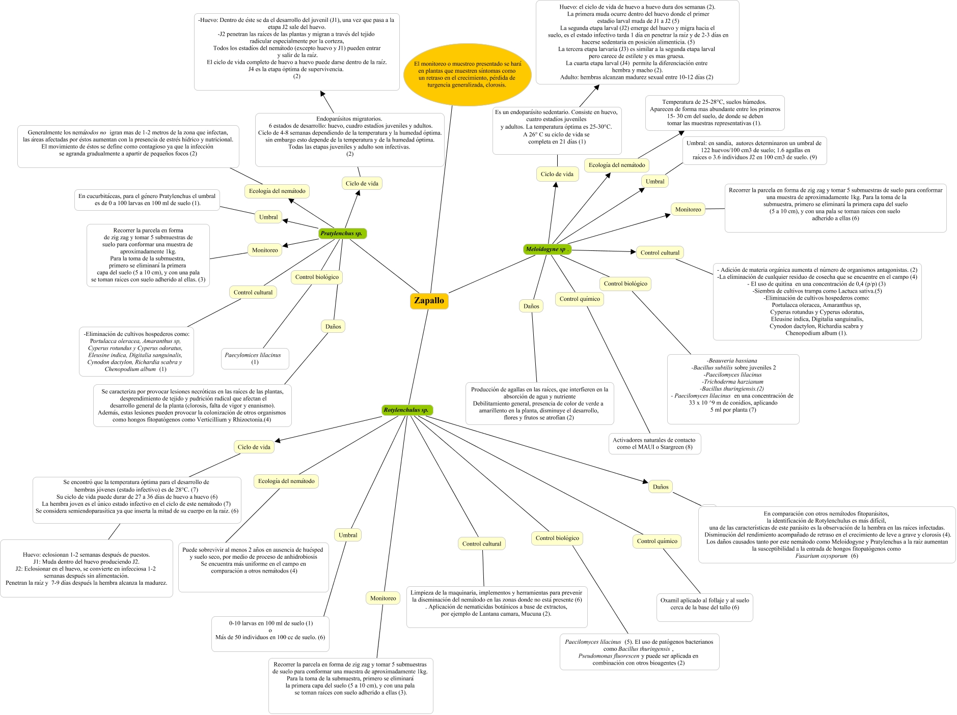 Este Cmap, tiene información relacionada con: mapa nemátodos FINAL!!!, Zapallo Pratylenchus sp. Ciclo de vida, Daños ???? En comparación con otros nemátodos fitoparásitos, la identificación de Rotylenchulus es más difícil, una de las características de este parásito es la observación de la hembra en las raíces infectadas. Disminución del rendimiento acompañado de retraso en el crecimiento de leve a grave y clorosis (4). Los daños causados tanto por este nemátodo como Meloidogyne y Pratylenchus a la raíz aumentan la susceptibilidad a la entrada de hongos fitopatógenos como Fusarium oxysporum (6), Zapallo Meloidogyne sp. Ecología del nemátodo, Zapallo Pratylenchus sp. Daños, Zapallo Rotylenchulus sp. Control biológico, Daños ???? Producción de agallas en las raíces, que interfieren en la absorción de agua y nutriente Debilitamiento general, presencia de color de verde a amarillento en la planta, disminuye el desarrollo, flores y frutos se atrofian (2), Zapallo Pratylenchus sp. Ecología del nemátodo, Zapallo Pratylenchus sp. Control cultural, Ciclo de vida Endoparásitos migratorios. 6 estados de desarrollo: huevo, cuadro estadíos juveniles y adultos. Ciclo de 4-8 semanas dependiendo de la temperatura y la humedad óptima. sin embargo esto depende de la temperatura y de la humedad óptima. Todas las etapas juveniles y adulto son infectivas. (2) -Huevo: Dentro de éste se da el desarrollo del juvenil (J1), una vez que pasa a la etapa J2 sale del huevo. -J2 penetran las raíces de las plantas y migran a través del tejido radicular especialmente por la corteza, Todos los estadíos del nemátodo (excepto huevo y J1) pueden entrar y salir de la raíz. El ciclo de vida completo de huevo a huevo puede darse dentro de la raíz. J4 es la etapa óptima de supervivencia. (2), Control cultural ???? -Eliminación de cultivos hospederos como: Portulacca oleracea, Amaranthus sp, Cyperus rotundus y Cyperus odoratus, Eleusine indica, Digitalia sanguinalis, Cynodon dactylon, Richardia scabra y Chenopodium album (1), Zapallo Meloidogyne sp. Umbral, Control cultural ???? Limpieza de la maquinaria, implementos y herramientas para prevenir la diseminación del nemátodo en las zonas donde no está presente (6) . Aplicación de nematicidas botánicos a base de extractos, por ejemplo de Lantana camara, Mucuna (2)., Zapallo Meloidogyne sp. Control cultural, Zapallo ???? El monitoreo o muestreo presentado se hará en plantas que muestren síntomas como un retraso en el crecimiento, pérdida de turgencia generalizada, clorosis., Umbral ???? En cucurbitáceas, para el género Pratylenchus el umbral es de 0 a 100 larvas en 100 ml de suelo (1)., Daños ???? Se caracteriza por provocar lesiones necróticas en las raíces de las plantas, desprendimiento de tejido y pudrición radical que afectan el desarrollo general de la planta (clorosis, falta de vigor y enanismo). Además, estas lesiones pueden provocar la colonización de otros organismos como hongos fitopatógenos como Verticillium y Rhizoctonia.(4), Ecología del nemátodo ???? Generalmente los nemátodos no igran mas de 1-2 metros de la zona que infectan, las áreas afectadas por éstos aumentan con la presencia de estrés hídrico y nutricional. El movimiento de éstos se define como contagioso ya que la infección se agranda gradualmente a apartir de pequeños focos (2), Zapallo Meloidogyne sp. Control biológico, Zapallo Rotylenchulus sp. Control cultural, Zapallo Meloidogyne sp. Monitoreo