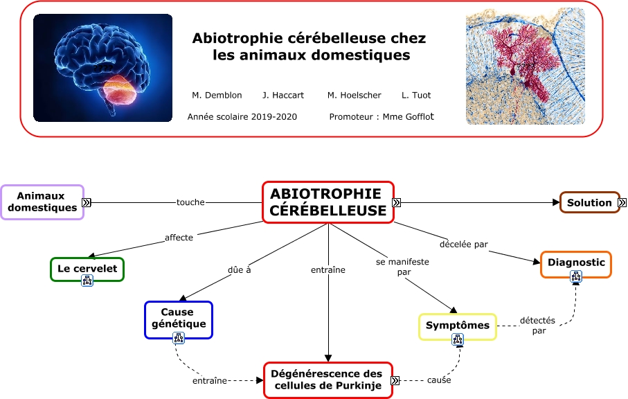 Cette carte de concepts créée avec IHMC CmapTools traite de: Abiotrophie Cérébelleuse, ABIOTROPHIE CÉRÉBELLEUSE Solution, ABIOTROPHIE CÉRÉBELLEUSE décelée par Diagnostic, CHIEN Plusieurs races touchées, ABIOTROPHIE CÉRÉBELLEUSE affecte Le cervelet, Que faire ? Euthanasie, Poulains normaux à la naissance, symptômes visibles à 4 mois, Apparition des symptômes à partir de l'âge mûr, CHIEN Plusieurs races touchées, Que faire ? Reproduction séléctive des reproducteurs, Croisés Pur-sang Poulains normaux à la naissance, symptômes visibles à 4 mois, Prédispositions ????, Symptômes détectés par Diagnostic, CHEVAL Touche seulement quelques races, Poulains normaux à la naissance, symptômes visibles à 4 mois s'aggravent Jusque 6-12 mois après apparition, ABIOTROPHIE CÉRÉBELLEUSE se manifeste par Symptômes, Cause génétique entraîne Dégénérescence des cellules de Purkinje, CHIEN Plusieurs races touchées Autres races, Que faire ? Soins palliatifs, Observation de la perte de cellules de Purkinje, ABIOTROPHIE CÉRÉBELLEUSE touche Animaux domestiques