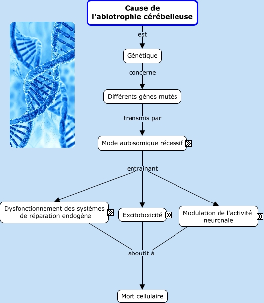 Cette carte de concepts créée avec IHMC CmapTools traite de: Cause génétique, GRM1 code pour Récepteur métabotrope du glutamate (mGlur) régulant l'homéostasie du calcium intracellulaire, Activation des récepteurs à glutamate même en absence de glutamate entraine Accumulation de calcium intracellulaire, CAPN1 muté SNP sur la séquence codante, Gènes identifiés CAPN1, Dysfonctionnement du système de détection des protéines mal repliées entraine Augmentation de la sensibilité au stress du RE liée à la toxicité des protéines mal repliées, GRID2 code pour Récepteur ionotrope du glutamate (GluRδ2), CAPN1 code pour Une sous-unité d'une cystéine protéase calcium-dépendante jouant un rôle dans la plasticité synaptique, Gènes identifiés SEL1L, Protéine inactive entraine Dégradation des neurites suite à l'absence de remodelage synaptique, GRM1 muté SNP sur la séquence codante, Réduction de l'expression du gène entraine Accumulation de mutations à l'ADN et de dommages oxydatifs, SNP sur la séquence codante aboutit à Protéine inactive, Gènes identifiés GRID2, RAB24 muté SNP sur la séquence codante, Déstabilisation du transporteur de glutamate (EAAT4) entraine Accumulation de glutamate dans la fente synaptique, SNP sur la séquence codante aboutit à Protéine inactive, GRM1 muté GRID2, SNP sur la séquence codante aboutit à Absence de liaison des autophagosomes aux lysosomes, SPTBN2 muté Délétion de 8 nucléotides, Augmentation de la sensibilité au stress du RE liée à la toxicité des protéines mal repliées menant à Absence du maintien de l'homéostasie par l'accumulation d'autophagosomes